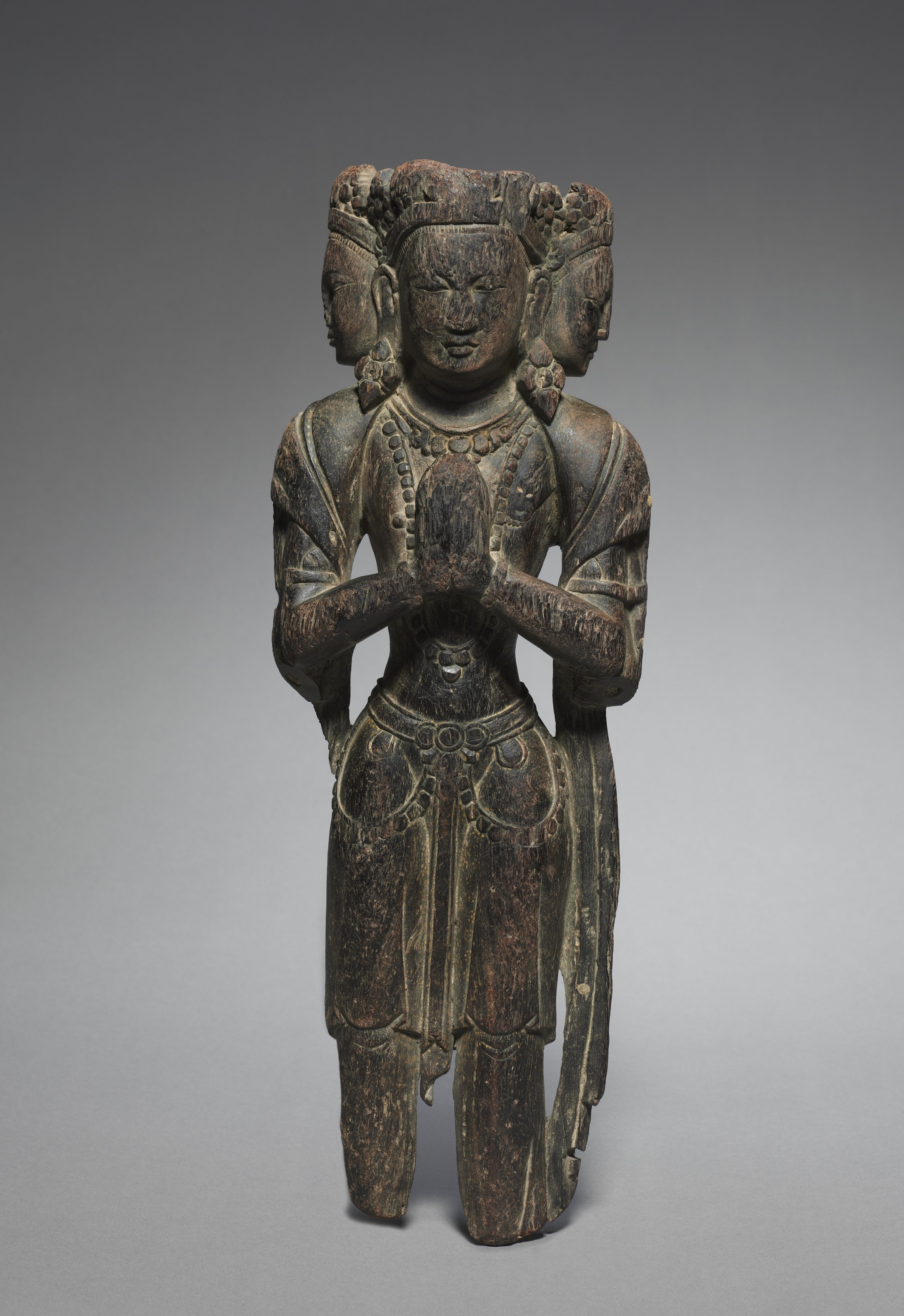 The Bodhisattva Avalokitesvara statue depicts a figure with three heads and two full bodies. The statue is dark brown. The central head faces forward with a subtle smile. Two additional heads are positioned on either side; they are smaller, facing left and right. The figure wears a robe, adorned with patterned designs on the chest and waist. A belt encircles the waist. The hands are clasped together in front of the chest. The statue displays signs of aging, with visible wear and tear on the surface. It stands against a gradient background transitioning from dark gray at the top to light gray at the bottom.
