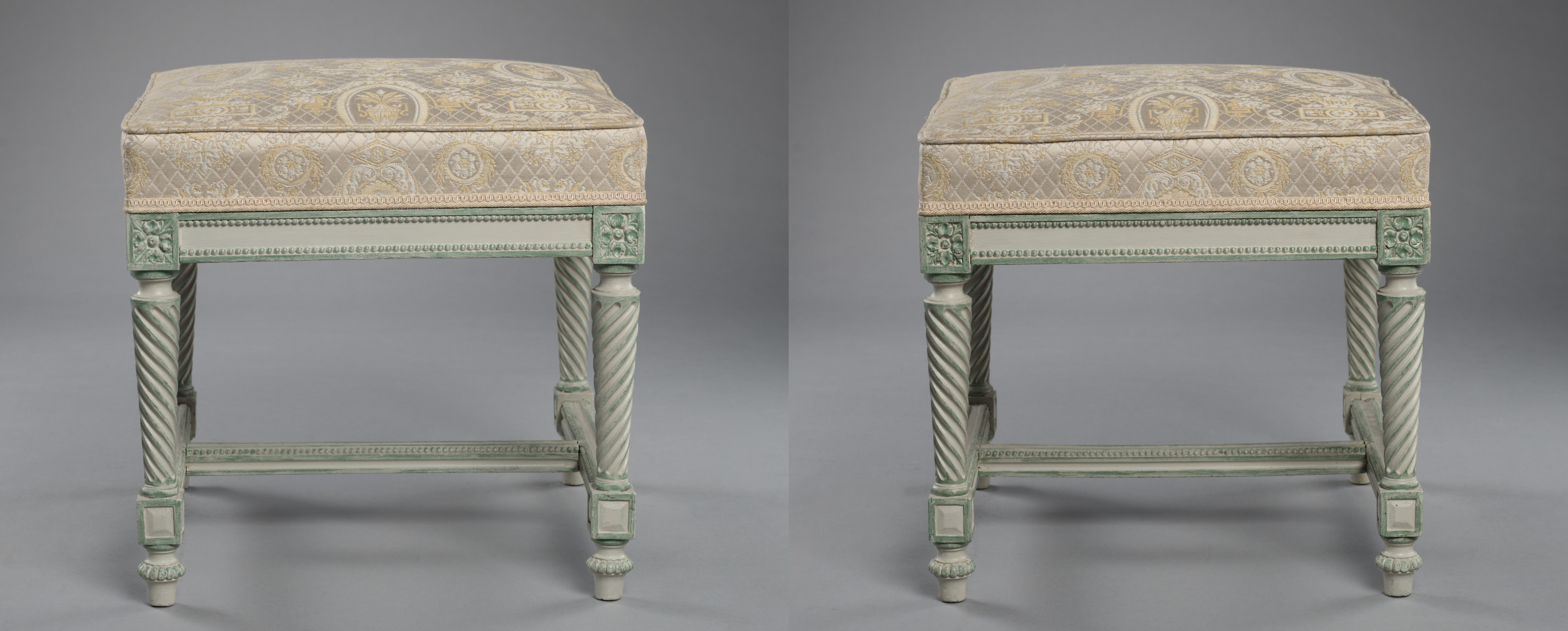 Two stools with green frames and beige upholstery, the frames have ornate carvings and twisted legs, the upholstery features a gold and cream-colored pattern, and a decorative border along the edges; by François-Honoré-Georges Jacob.