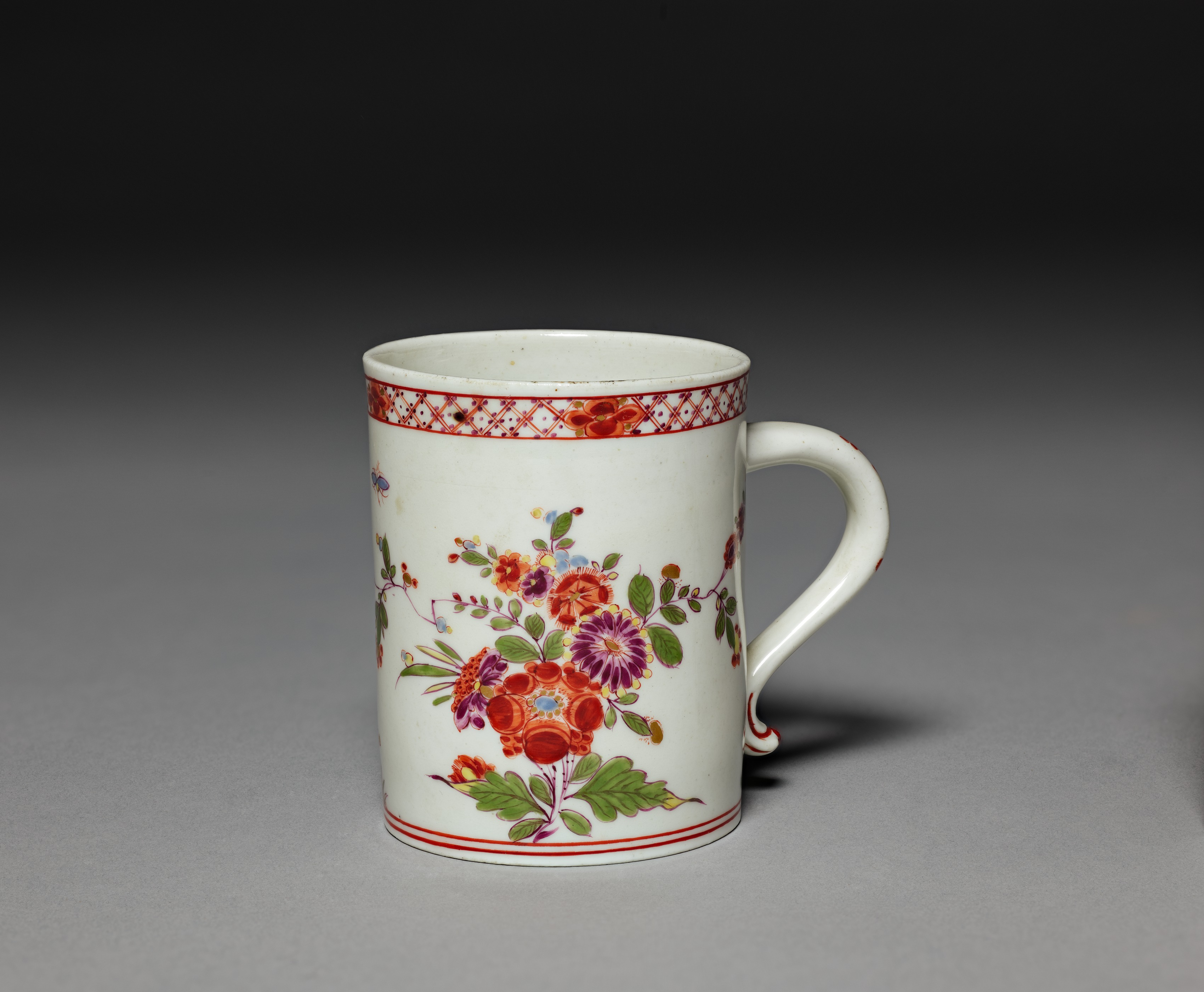 White porcelain mug with handle on right side. Mug is cylindrical with a slightly wider mouth. Red and white patterned band encircles top of mug. Red double line band encircles bottom of mug. Colorful floral design on body of mug. Flowers are shades of red, orange, purple, blue, and yellow. Leaves are green. Gray gradient background, dark at top and light at bottom. Mug casts shadow on right side.