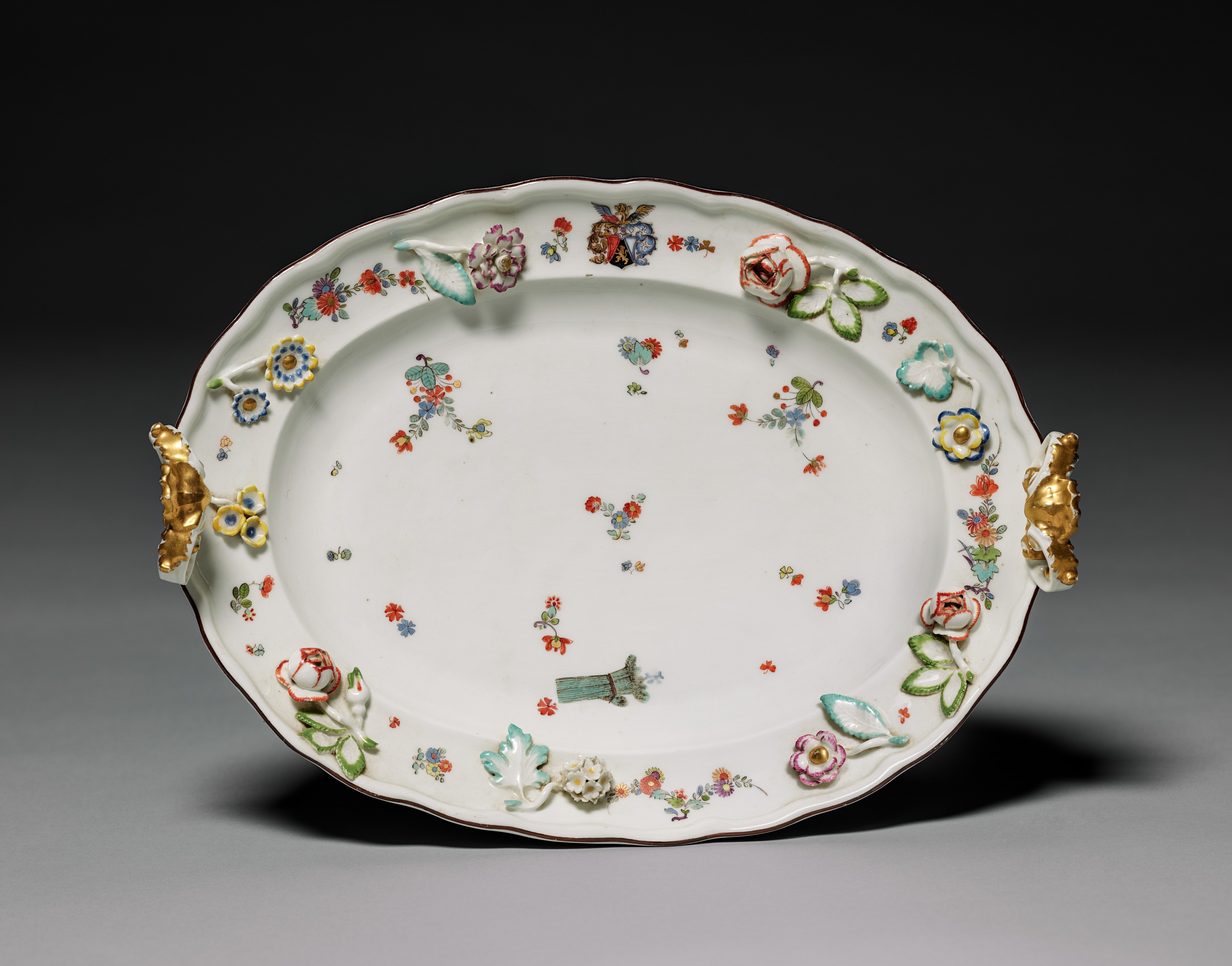 White porcelain tray with a scalloped edge and floral decorations. The tray has a white background with a red line around the edge. It features various colorful flowers and leaves around the rim. Two gold-colored handles are on either side. The tray is oval in shape and has a slight lip around the edge. The background of the image is dark gray to black, with the tray casting a shadow. The floral decorations include red, blue, yellow, and green colors. Small flowers are scattered across the interior of the tray. The tray appears to be an antique or decorative piece. It has a three-dimensional appearance with raised floral elements.