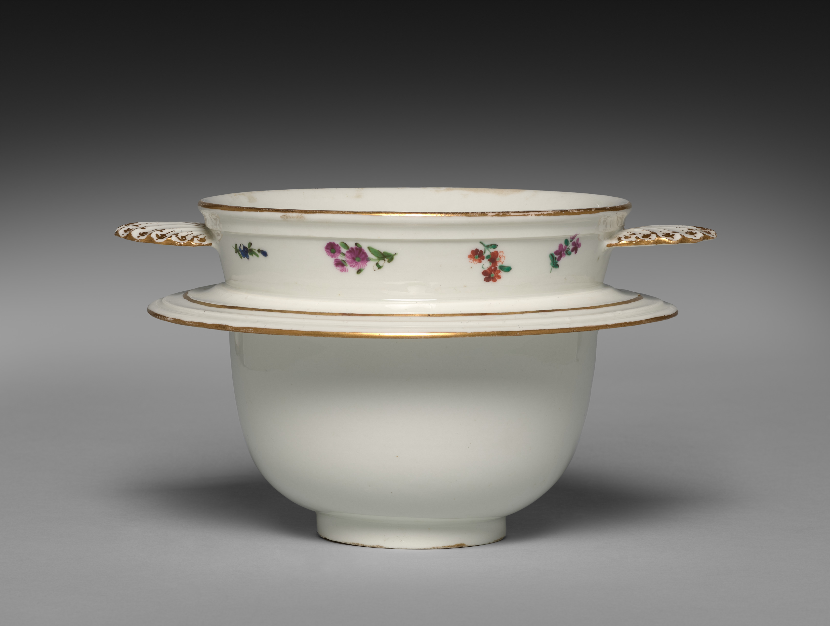 White porcelain food warmer with a wide mouth and a smaller base. Two handles on either side with white and gold design. The top section has a floral pattern with purple, pink, and green flowers. A gold rim borders the top and bottom. The bottom section is solid white with a small foot. The background is grey with a shadow underneath.