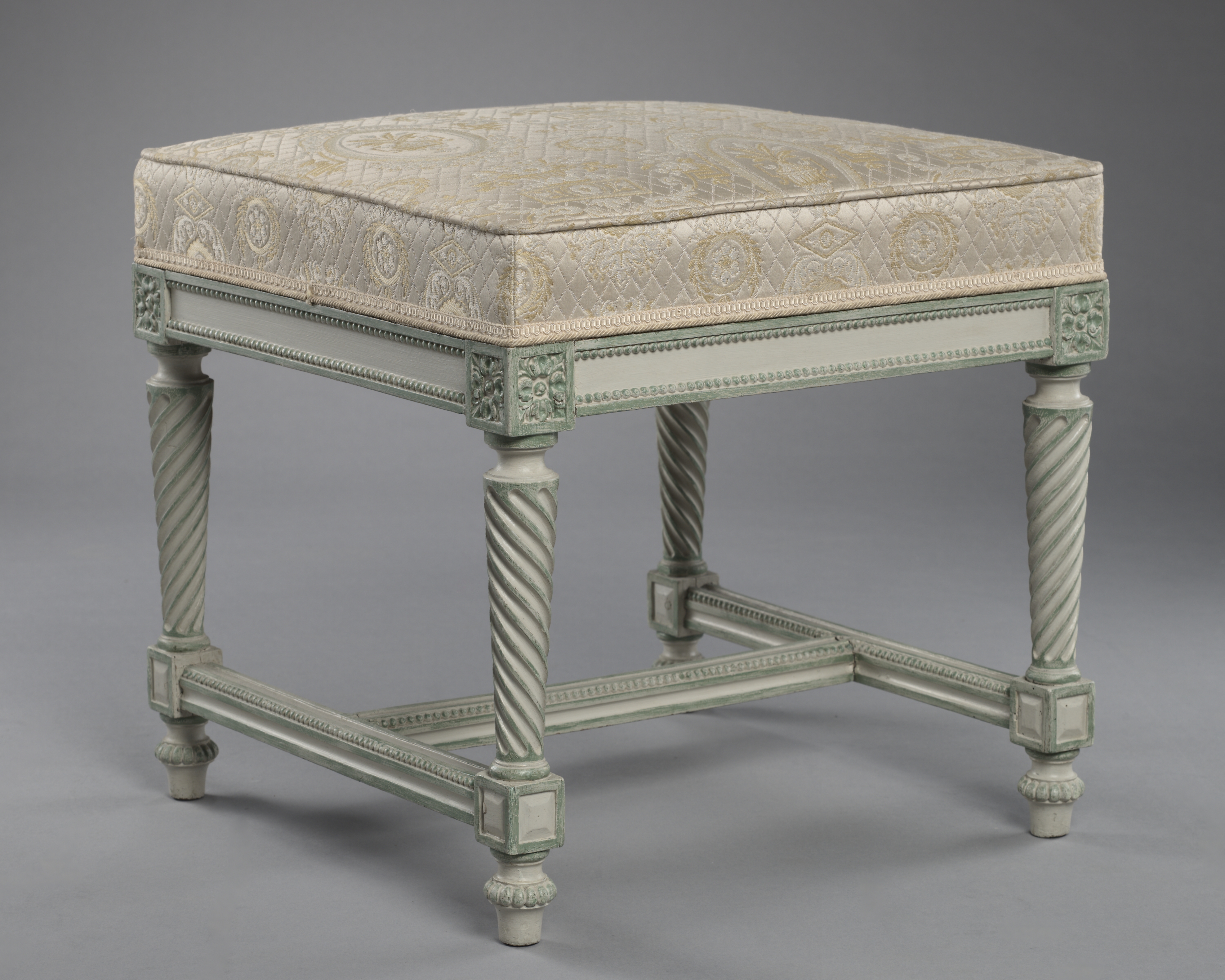 Square stool with a cushioned seat, cream and gold patterned fabric top. The legs are made of wood with a light greenish-gray finish, featuring spiral grooves, square blocks at the top and bottom, and small decorative feet. The frame has ornate carvings on the sides and legs. The stretcher has a similar design. The background is a gradient gray.
