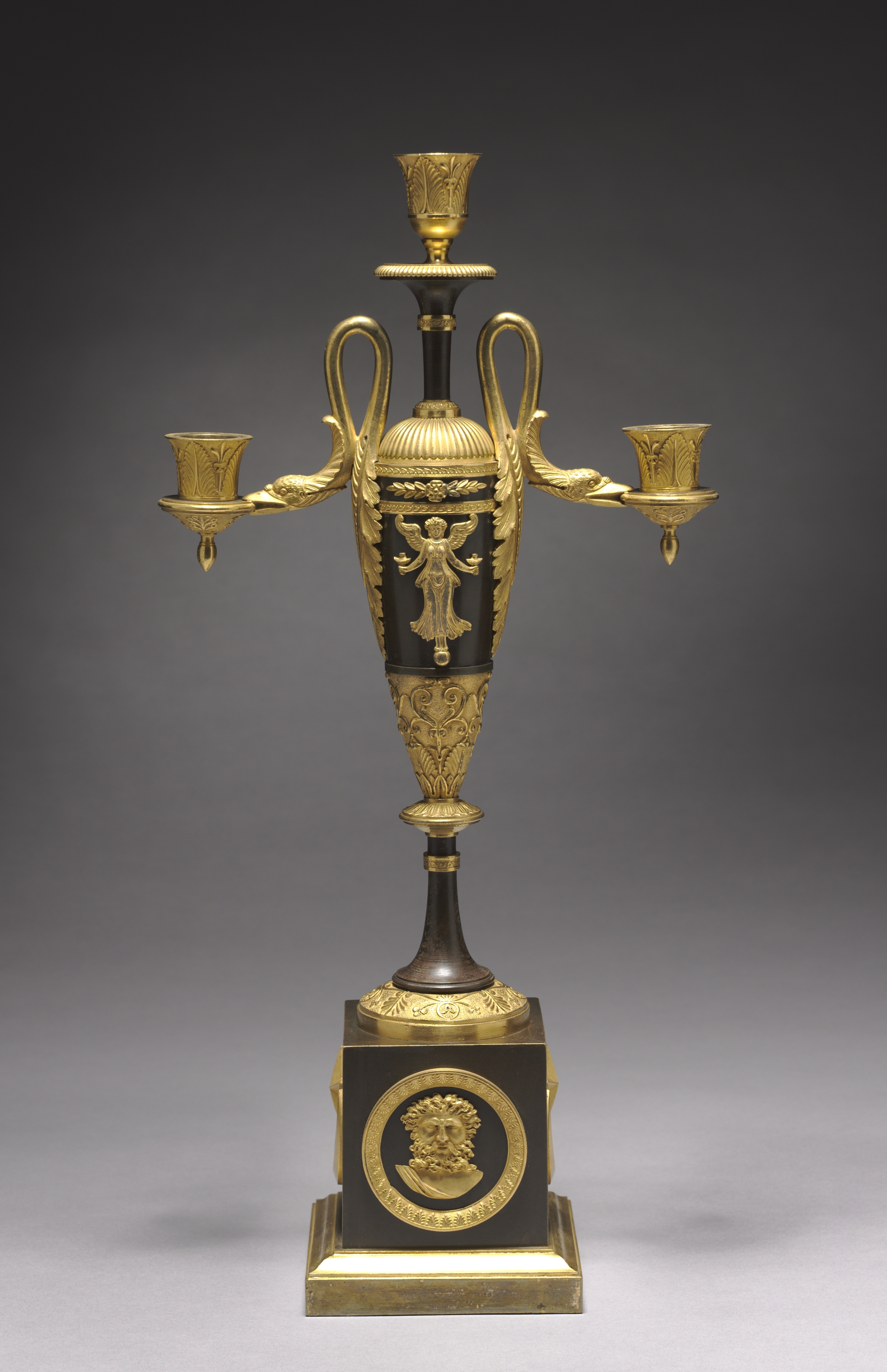 Black and gold candelabrum. Dark base square in shape with gold trim. A medallion on front featuring head of a man. Slightly tapered column rises from base, gold leaf pattern near top. Three arm-like protrusions with candle holders on end. Middle candle holder directly on top with single stem. Gold ornamentation throughout. Gold leaf designs. Gold and black color scheme. Medallion on front features a man's head. Candelabrum by artist titled "Candelabrum".
