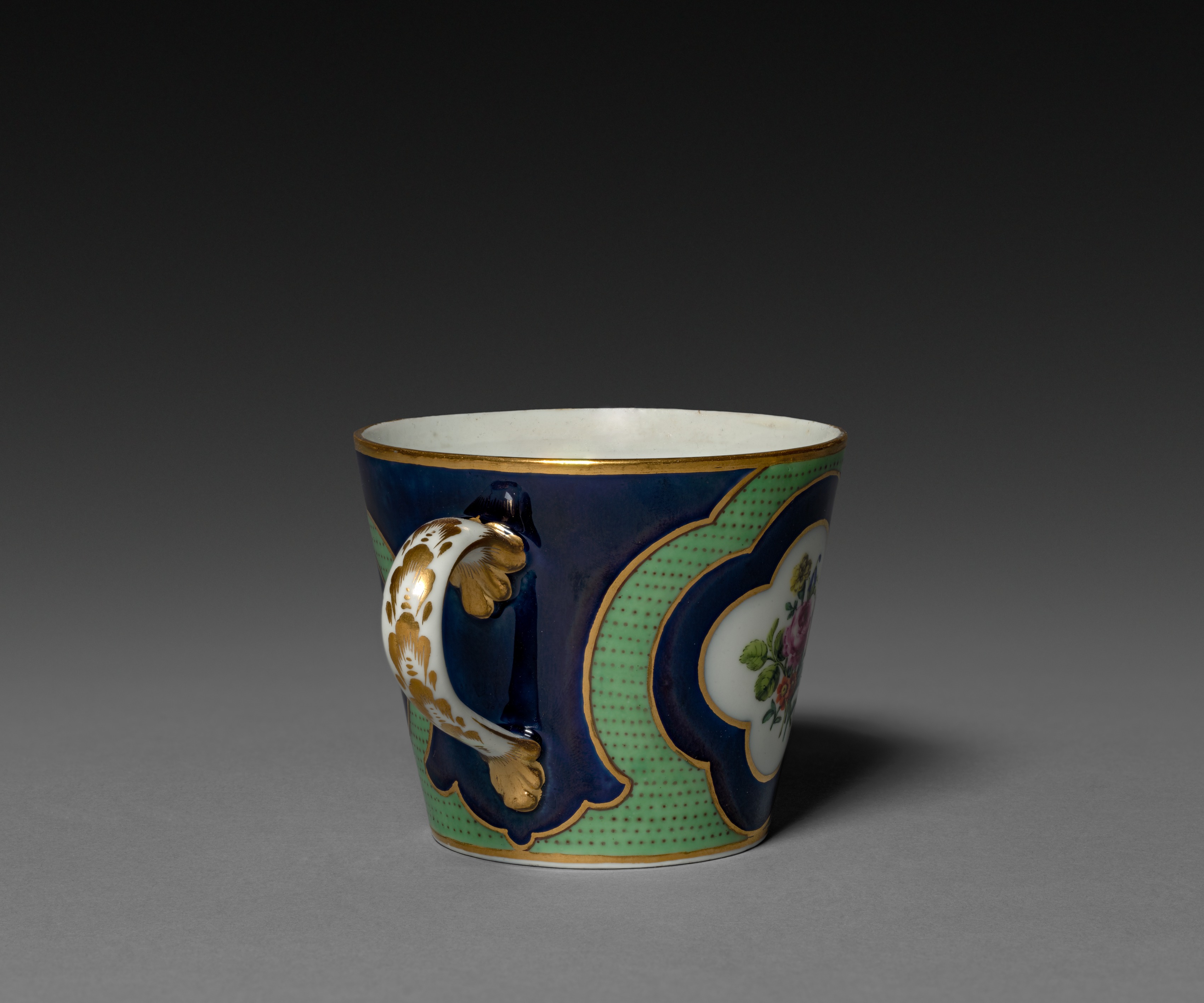 The cup has two handles and is made of porcelain. The cup is dark blue with a light green curved shape outlined in dark blue and dotted with small dark green dots. There is gold trim around the top. One handle is white with gold accents, and there is a white section with a floral design. The cup has a wide mouth and tapers slightly towards the bottom. The background is dark grey, with the cup casting a shadow to the right.