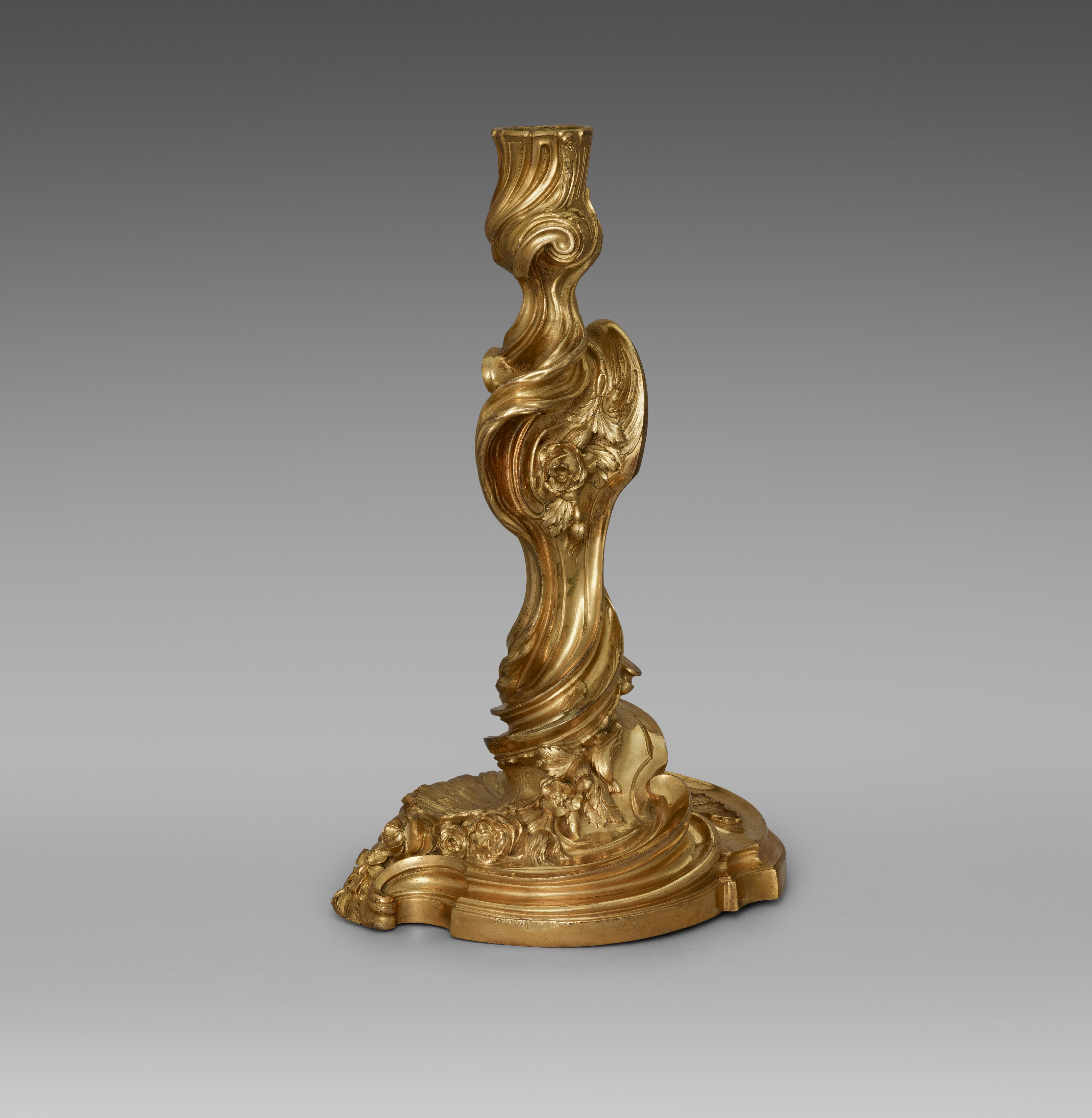 Gold candlestick with a wide, round base featuring a decorative edge. The stem of the candlestick is ornate and twisted, resembling a piece of fabric or a leafy vine. The stem has a wavy, organic shape with curved lines and swirling patterns. The top of the candlestick is cup-shaped and flares out slightly. The entire piece appears to be made of metal, possibly brass or bronze, and has a shiny, reflective surface. The background is a gradient from dark gray at the top to light gray at the bottom.