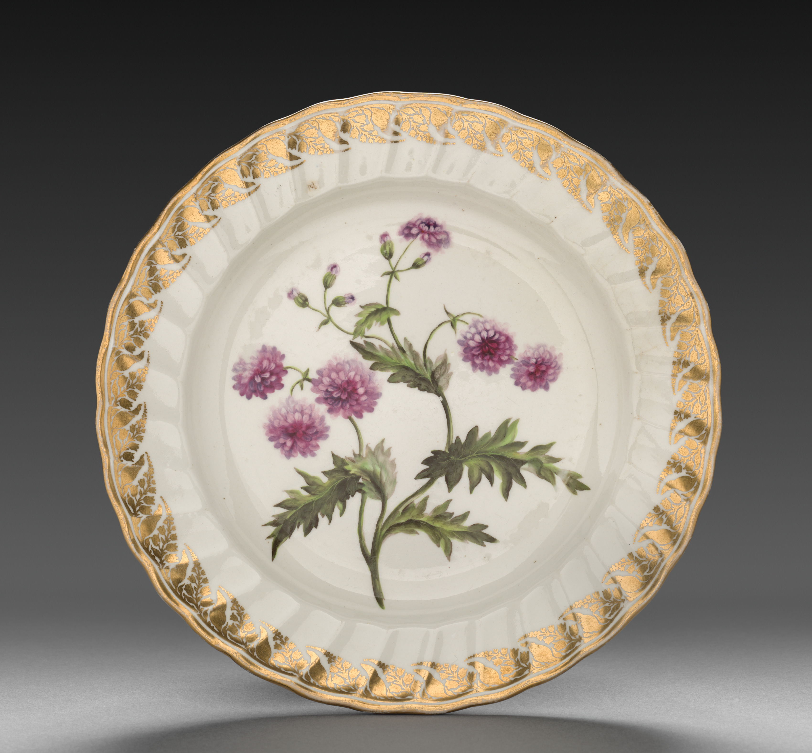 White plate with scalloped edge and gold trim. Gold trim on rim has leaf-like pattern. Plate has purple flowers with green stems and leaves in center. Background of image is dark gray, getting lighter toward bottom.