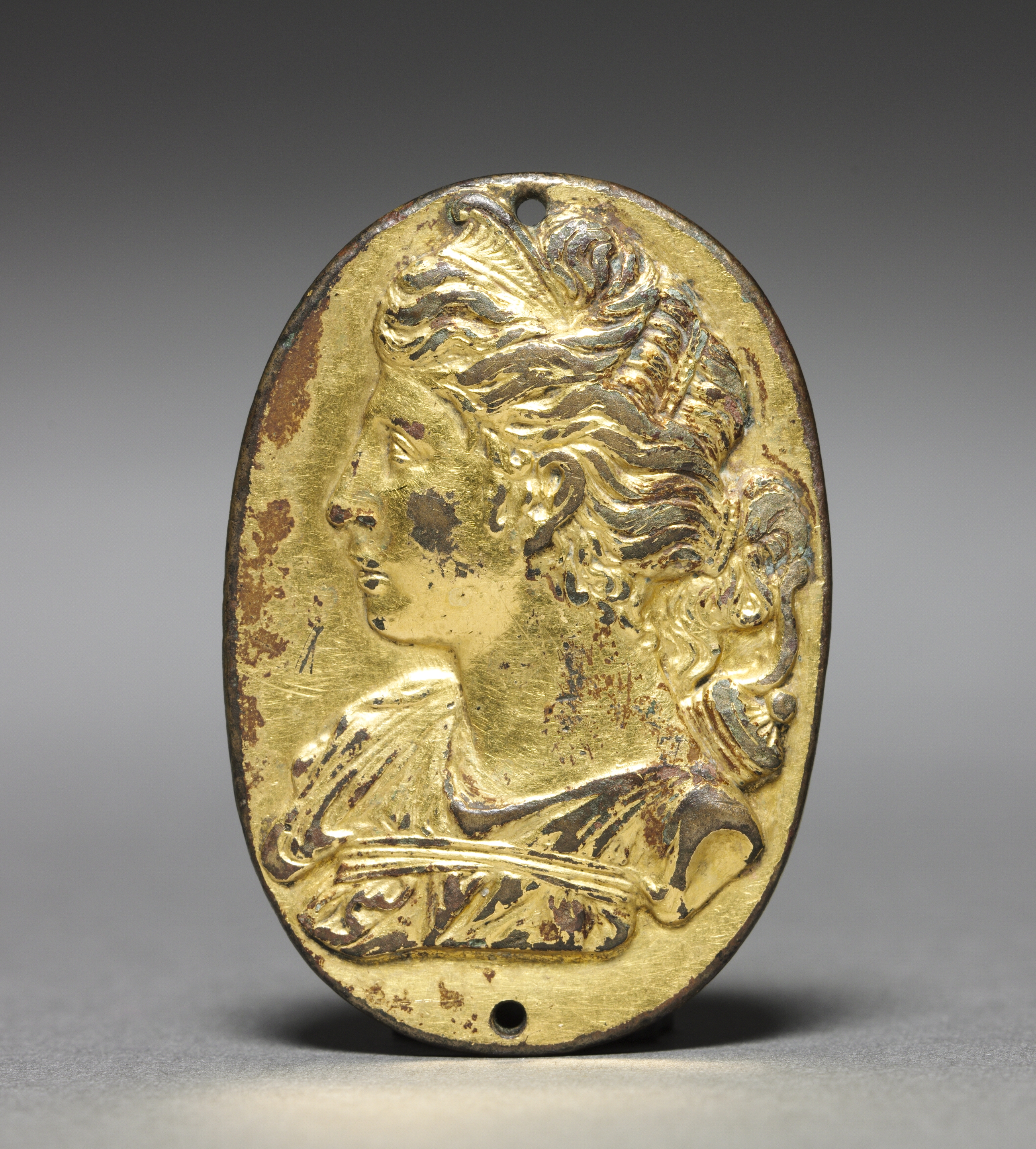 Oval gold-colored medallion with a relief portrait of a woman's head and shoulders. The woman has long, wavy hair and appears to be wearing a garment with folds. The medallion has a small hole at the top and bottom. The surface shows signs of wear with some areas appearing more tarnished than others. The background of the image is a gradient from dark gray at the top to light gray at the bottom. The medallion is titled "Bust of a Woman (Diana?)" and is by an unknown artist.