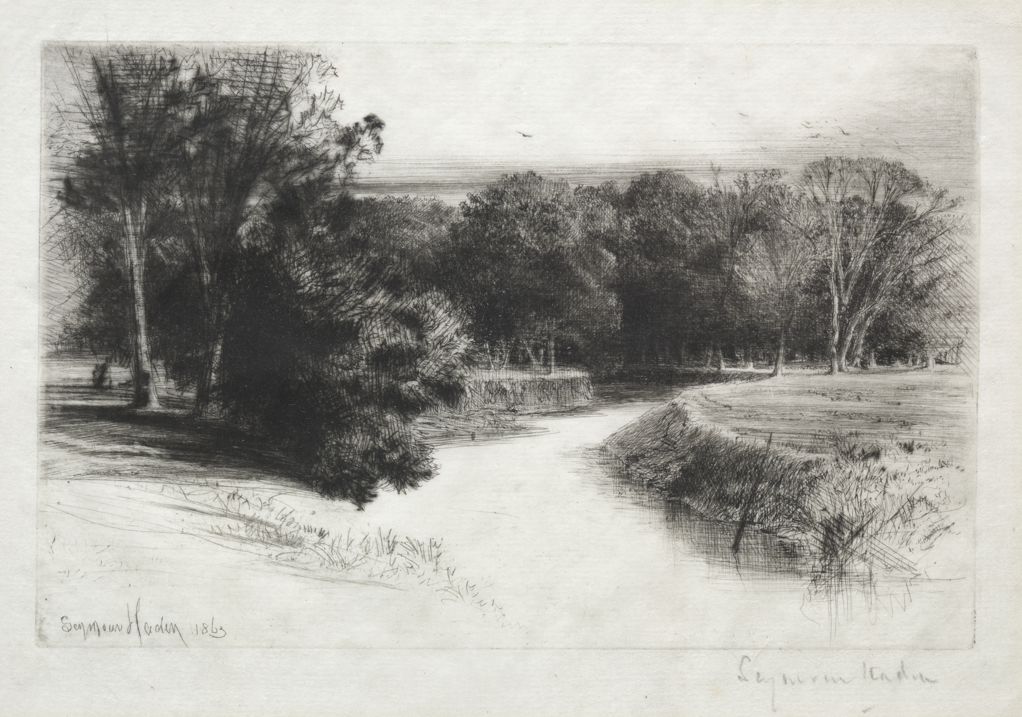 Black and white landscape with trees, grass and a body of water. The image depicts a river or stream running through a wooded area. The artwork is signed in the bottom-left corner with a year. A second signature is present in the bottom-right corner. The scene shows a riverbank with grass and trees on either side. The body of water extends into the background, where it meets a line of trees. The sky above appears light.