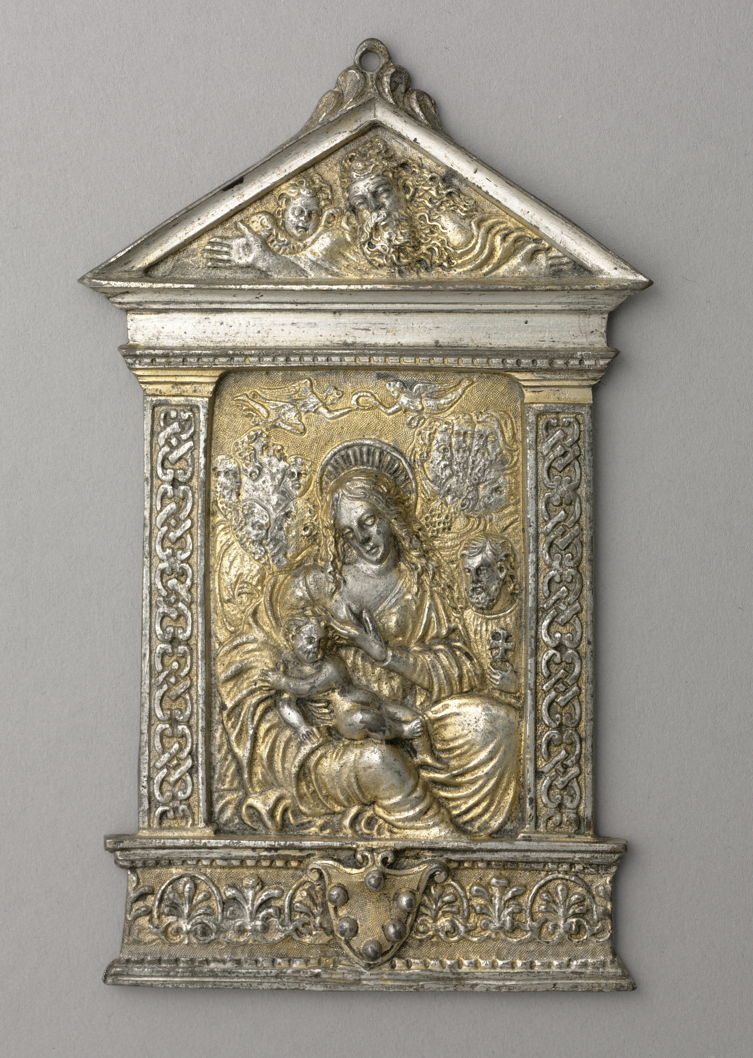 Triangular pediment at top with two human faces and leaves carved into it. Rectangular frame below pediment with intricate border design on sides and bottom. Central image of Madonna sitting and holding Child with hands, Child sitting on Madonna's lap and looking down. Madonna and Child both with halos. Background of central image has several circular designs. Gray and gold color.