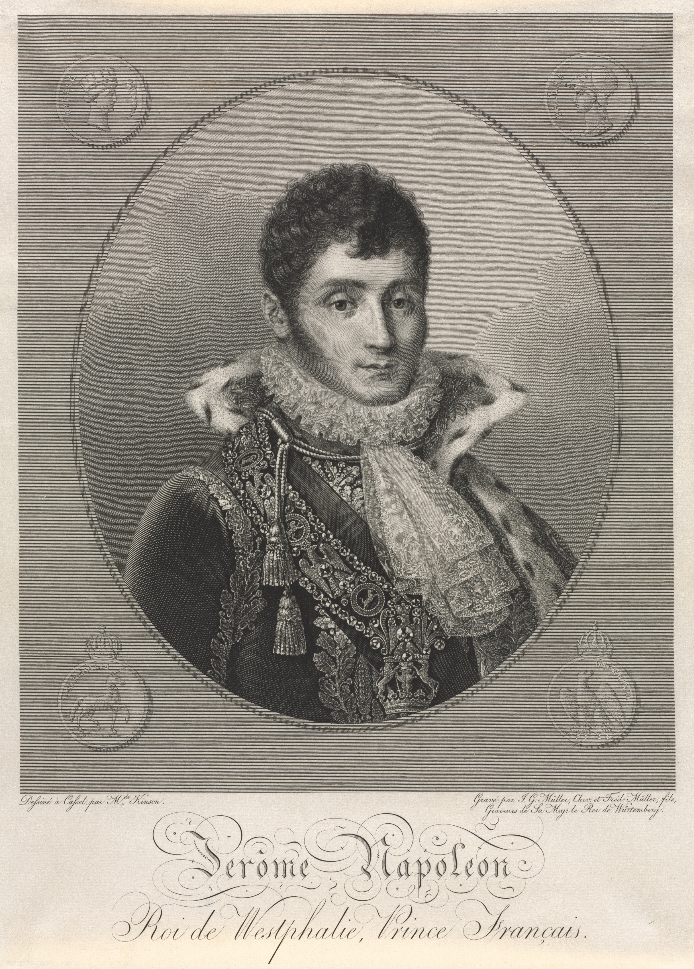 Black and white portrait of a man with short curly hair. He wears a dark jacket with ornate embroidery and a large lace collar. The portrait is oval-shaped and set against a rectangular background with thin horizontal lines. Four circular emblems, featuring crowns and eagles, are positioned at the corners of the background. The man's attire includes a decorative sash or ribbon with tassels. He looks directly at the viewer with a neutral expression. Text below the portrait reads "Jerome Napoleon, King of Westphalia, French Prince".