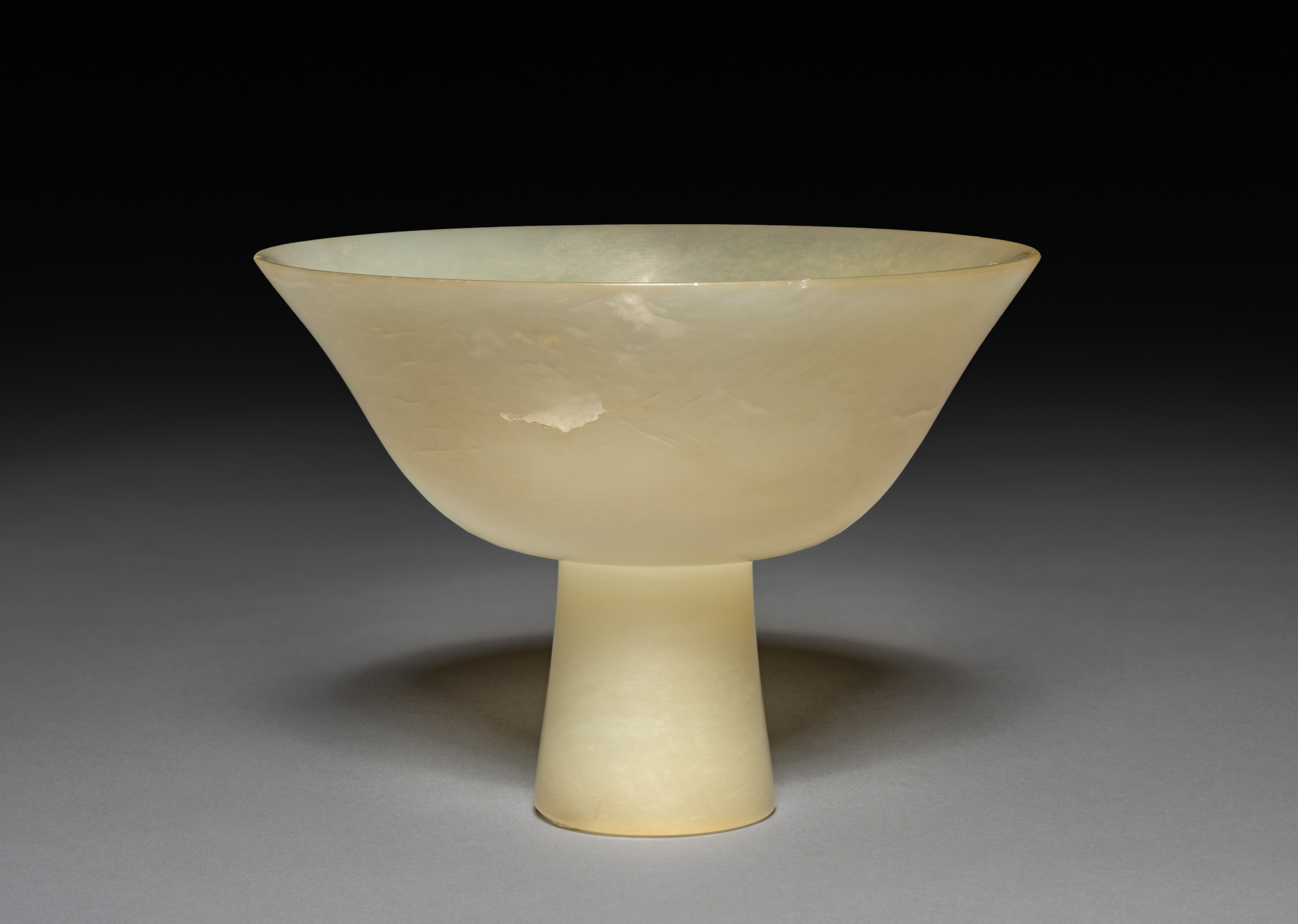 Pale yellow stem cup with a wide bowl and narrow stem, made of a smooth material resembling jade or glass, with a subtle sheen and faint texture on the bowl's surface. The bowl is flared and rounded, while the stem is cylindrical and tapered. The background is dark at the top and light gray at the bottom, with a shadow cast by the cup. Stem Cup by René Lalique.