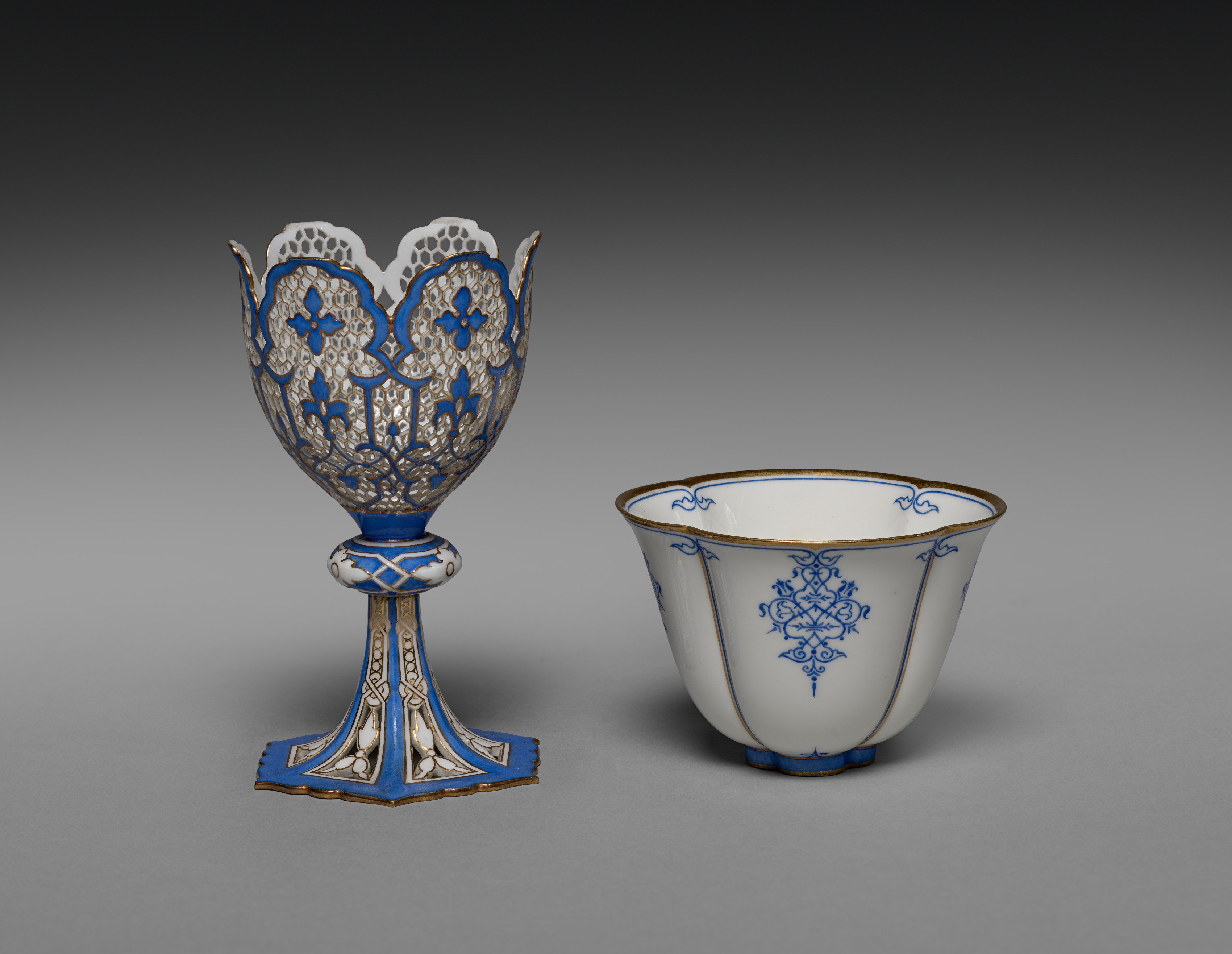 The image shows two pieces of ceramic art: a cupholder and a cup. The cupholder has a blue base with a gold pattern and a white rim. The cupholder's body features a blue and gold design with a pattern resembling lace or filigree. The cupholder's stem is blue with a gold pattern and a hexagonal base. The cup is white with a blue design and a gold rim. The cup features a blue floral-like pattern on its sides and a blue and gold rim. The background of the image is gray with a gradient that gets darker towards the top.