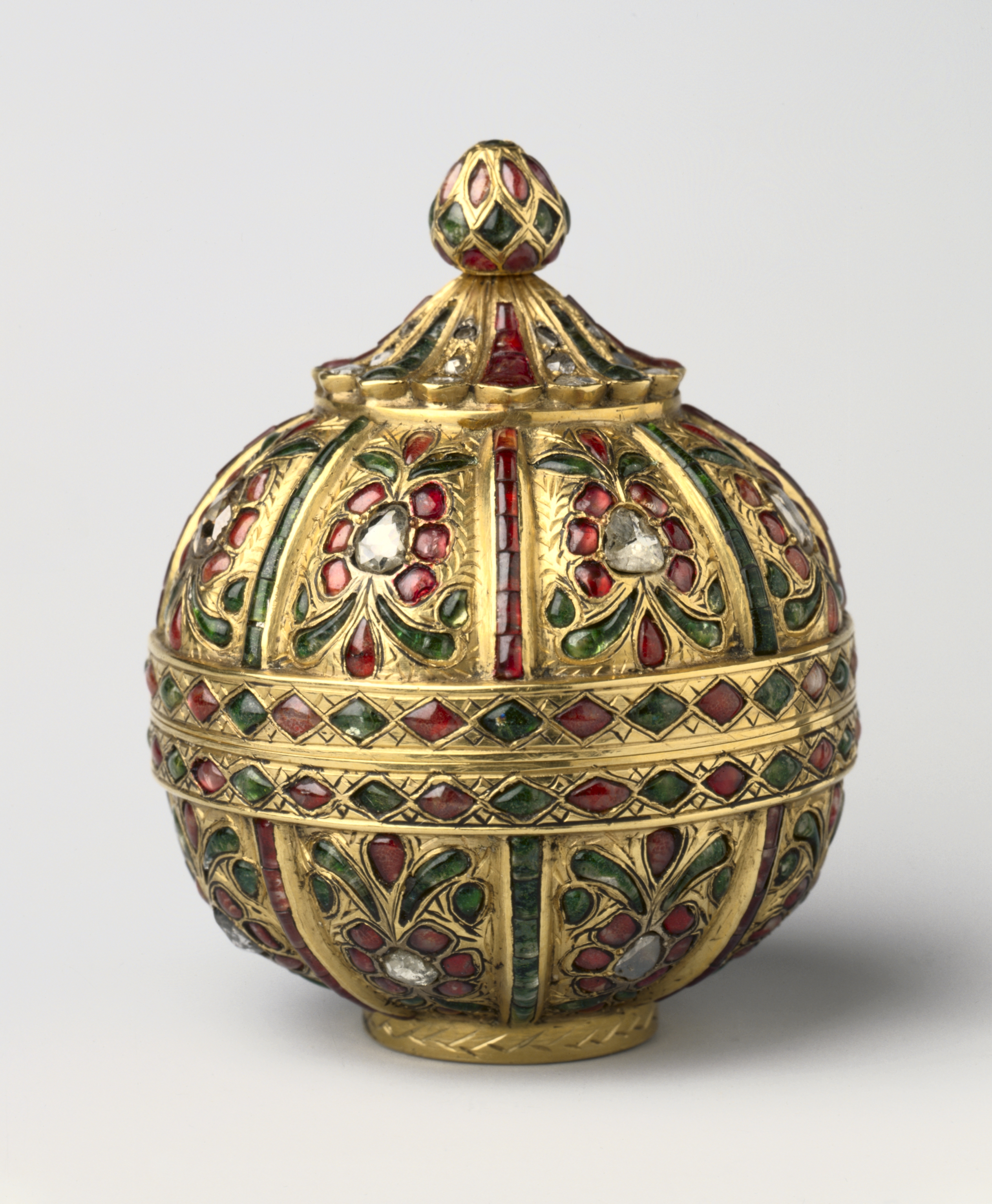 Globular-shaped box decorated with gems by artist unknown. Gold-colored metal box with a spherical shape and a small knob on top of the lid. The box features a floral pattern with red, green, and white gems. The gems are arranged in a symmetrical design, with the red gems forming teardrop shapes and the green gems forming leaves. The white gems are round and resemble diamonds. The box has a small foot at the bottom and a hinge on one side of the lid. The background of the image is gray.