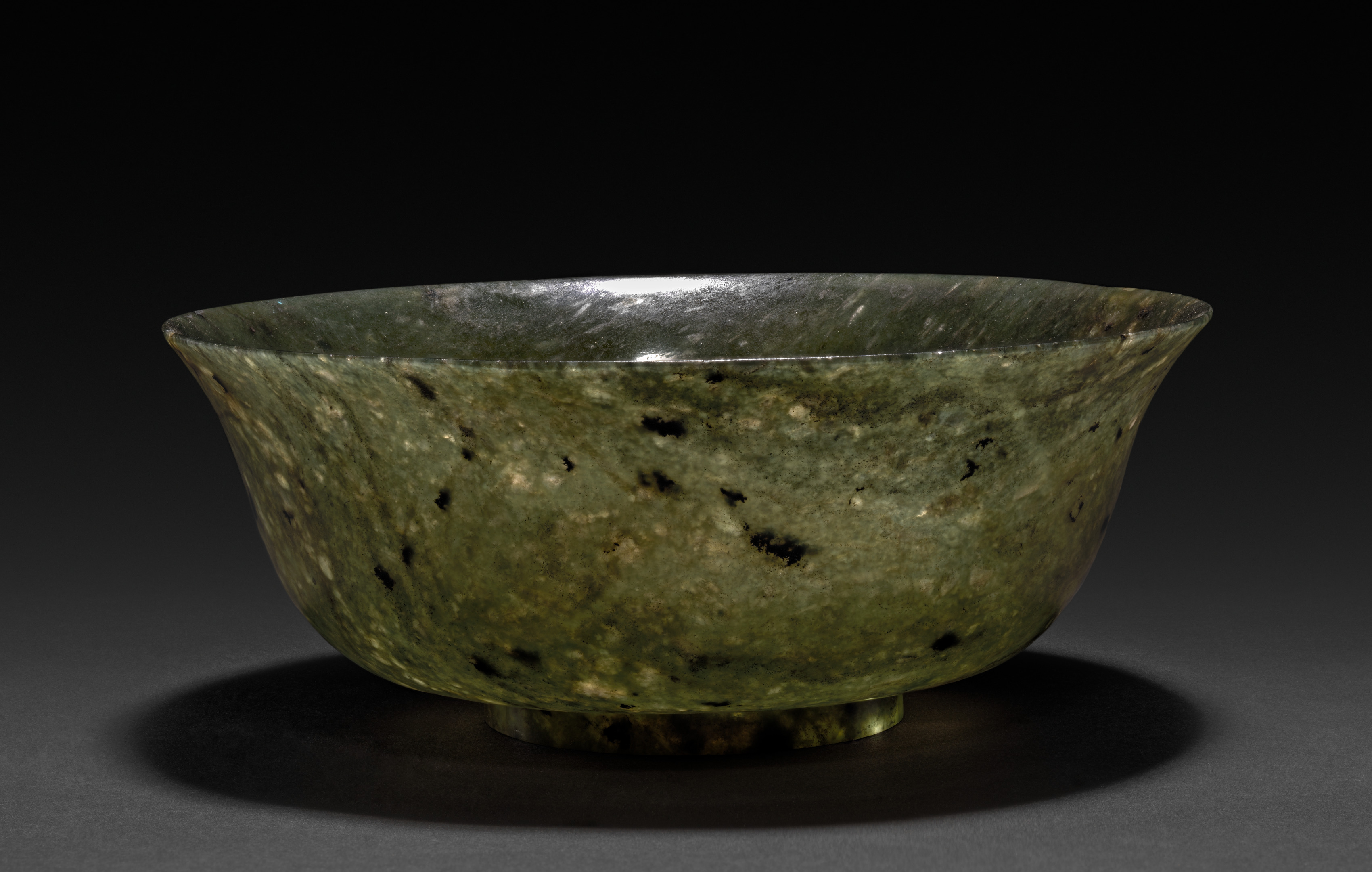 The image depicts a bowl by artist unknown titled "Bowl". The bowl is made of green stone with black and white speckles. The bowl is rounded with a wide mouth and a narrow base. It has a glossy finish. The bowl is sitting on a small footed base. The background is dark gray, and the bowl casts a shadow on the surface below it.