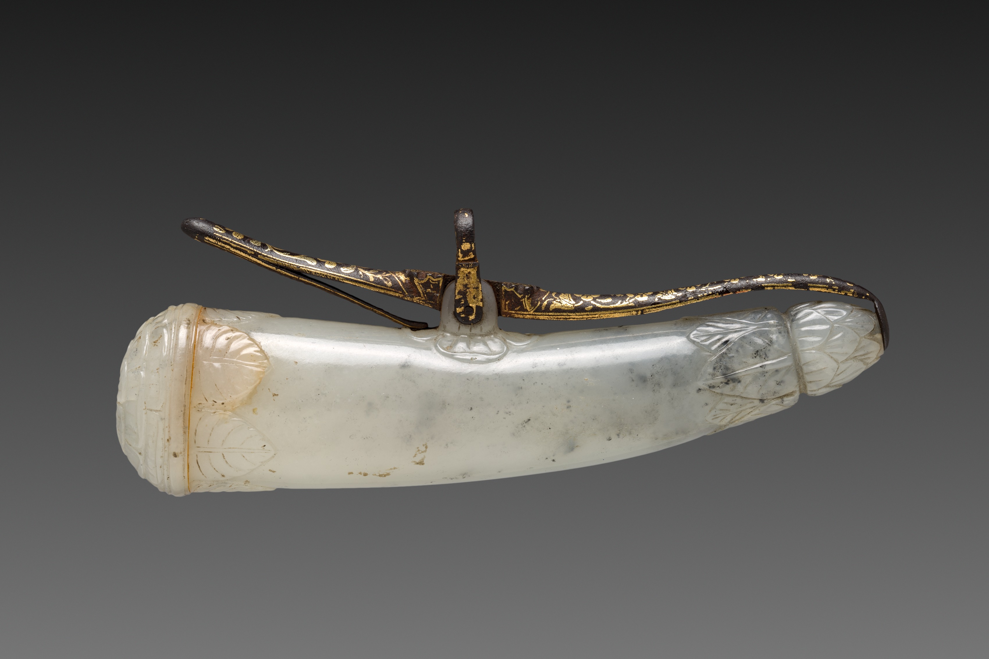 Powder horn by Unknown. White, elongated, curved object with a rounded end and a narrower end; made of stone or shell, featuring carved designs and gold and black metal components on top. The gold and black metal components have a decorative design. A small knob is in the center, with two long, thin arms extending outward. The background is dark gray.
