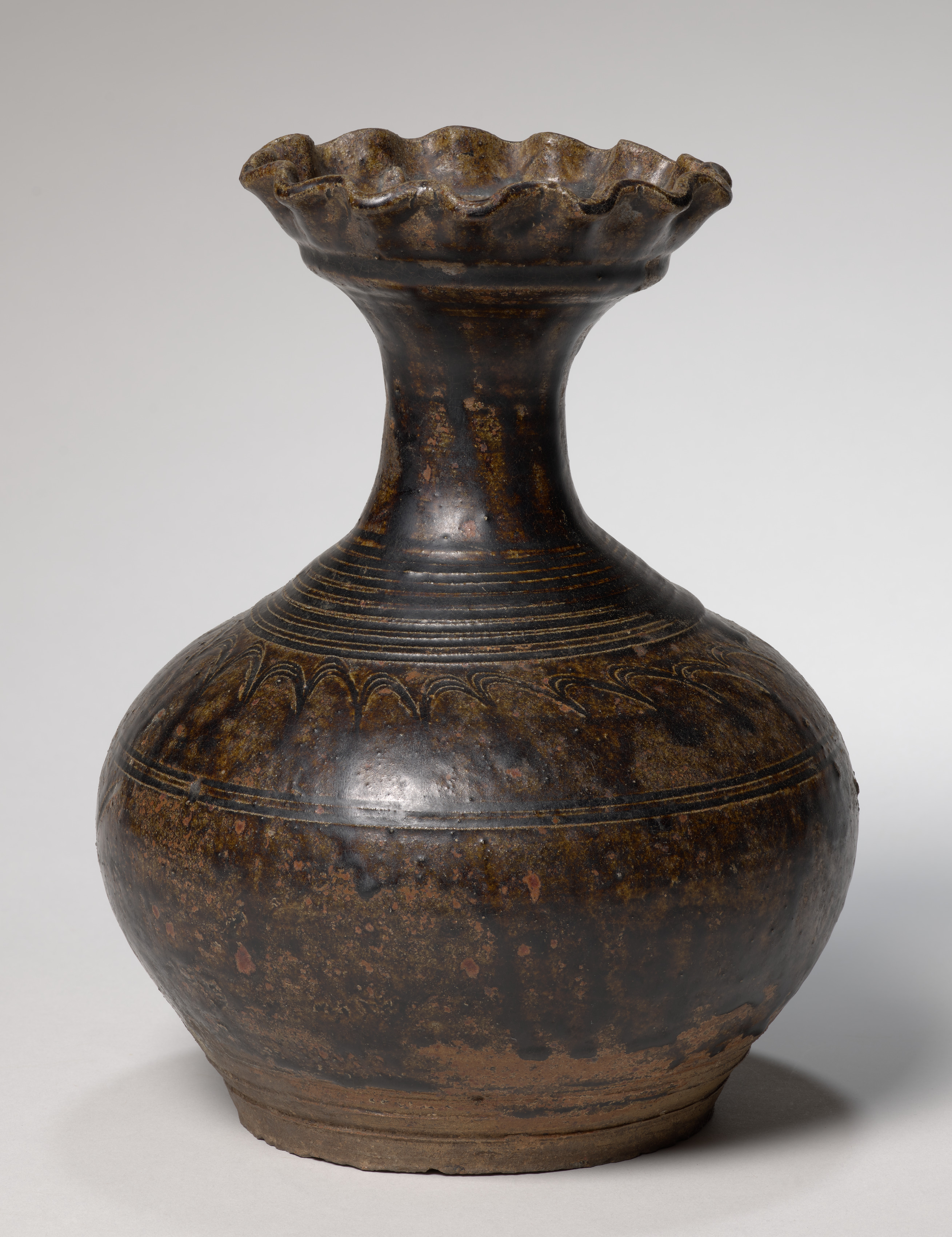 The Khmer Vase by the artist depicts a brown vase with a wide body and a narrow neck. The vase has a ruffled top edge and features engraved designs around its middle section. The body of the vase is bulbous, and the base is round. The vase appears to be made of clay or ceramic material and has a dark brown color with lighter brown accents. The background of the image is white, suggesting that it may be a product photo or a museum exhibit. The vase casts a shadow on the surface below it.