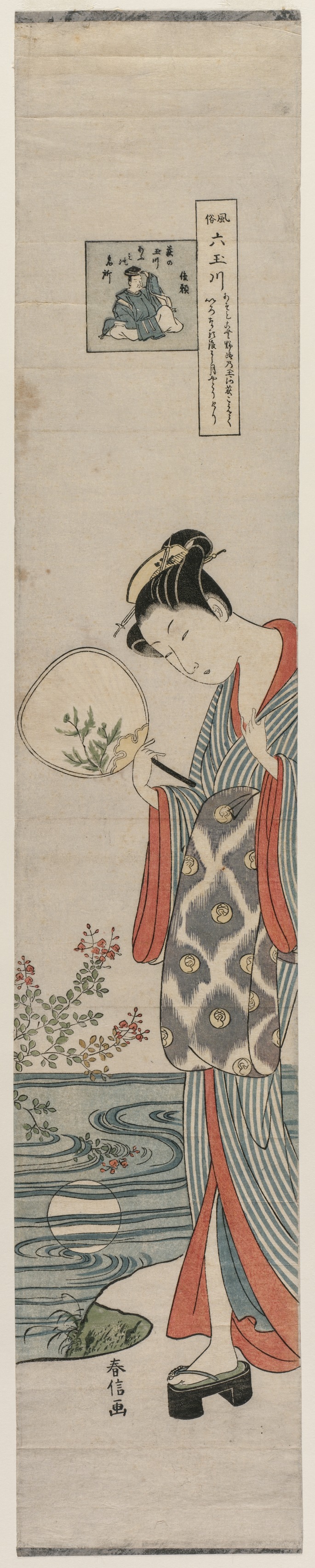 The image depicts a woman wearing a kimono. The kimono has a grey background with a white pattern and gold accents, red lining and grey and white striped sleeves. She has black hair and black shoes. The woman is holding a handheld round fan in her right hand. The fan depicts greenery against a white background. The woman appears to be standing on a shoreline. There are flowers to her left. The water behind her and the flowers are depicted in shades of blue and green. A small inset image of a seated man and a block of text are at the top. The background of the image is beige.
