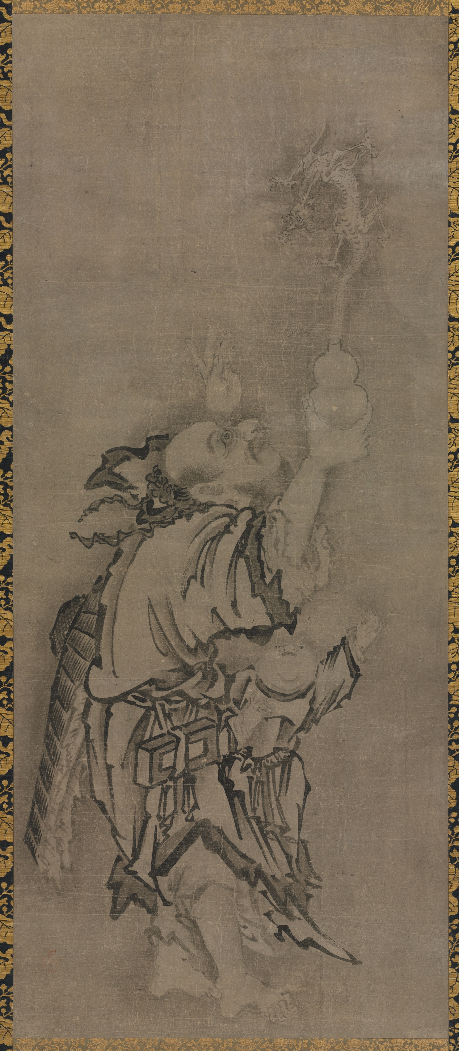 The image depicts Hotei with Daoist Immortals. The artwork features an immortal holding a gourd with a dragon emerging from it. The immortal stands on one leg with the other bent behind him. He wears a loose-fitting robe. His left arm is raised holding the gourd from which the dragon emerges, while his right hand appears to be open and facing outward. The background of the image features muted brown hues. A decorative border frames the image on both sides, with a black base and gold floral designs.