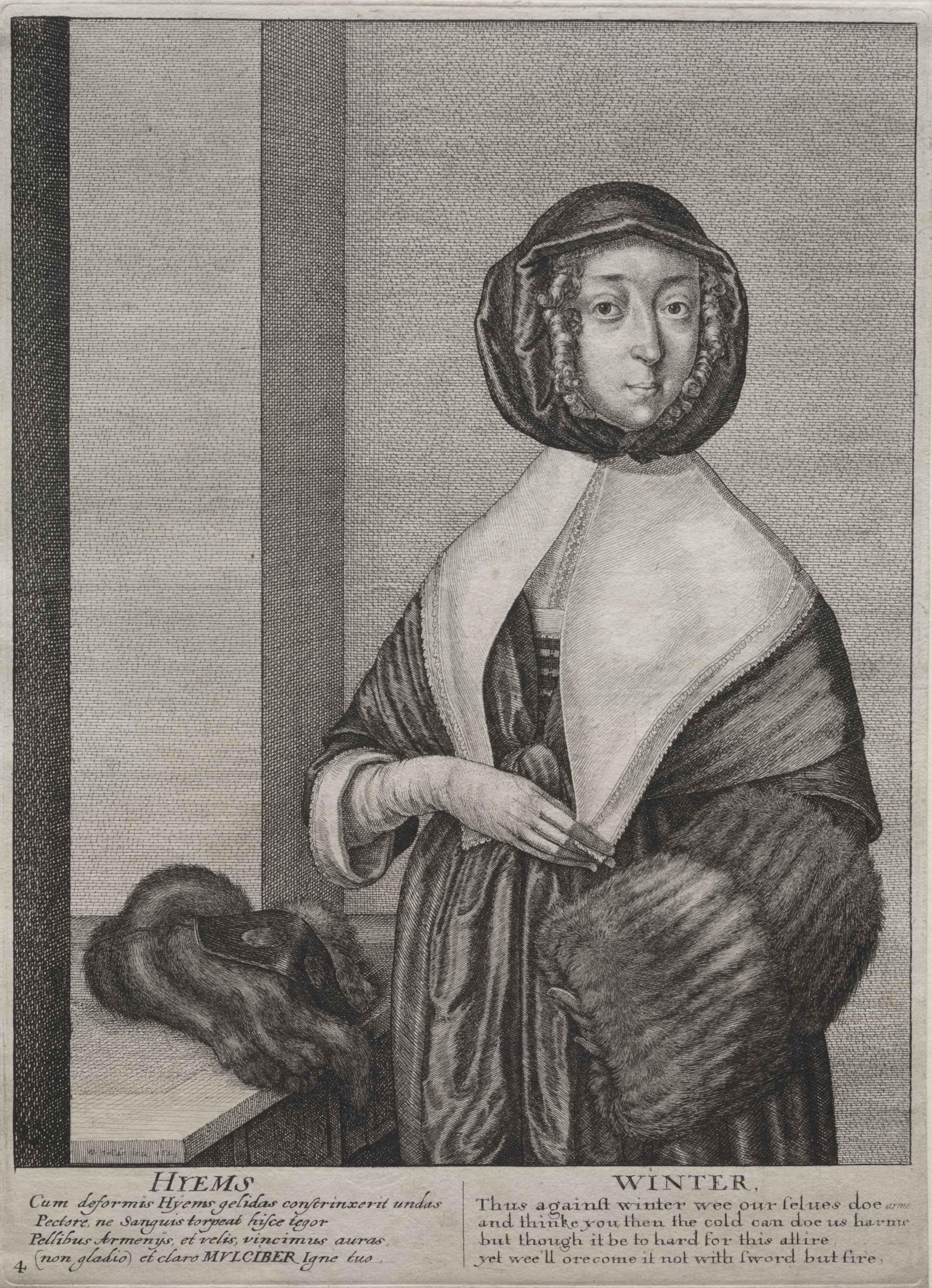 Black and white engraving of a woman; woman has short curled hair; woman wears a hooded fur trimmed shawl; woman wears a head covering; woman shown from waist up; right hand on top of left hand; left hand fur covered; two columns to left of woman; fur on left edge of table; Latin and English text beneath image; text to left reads "HYEMS"; text to right reads "WINTER".
