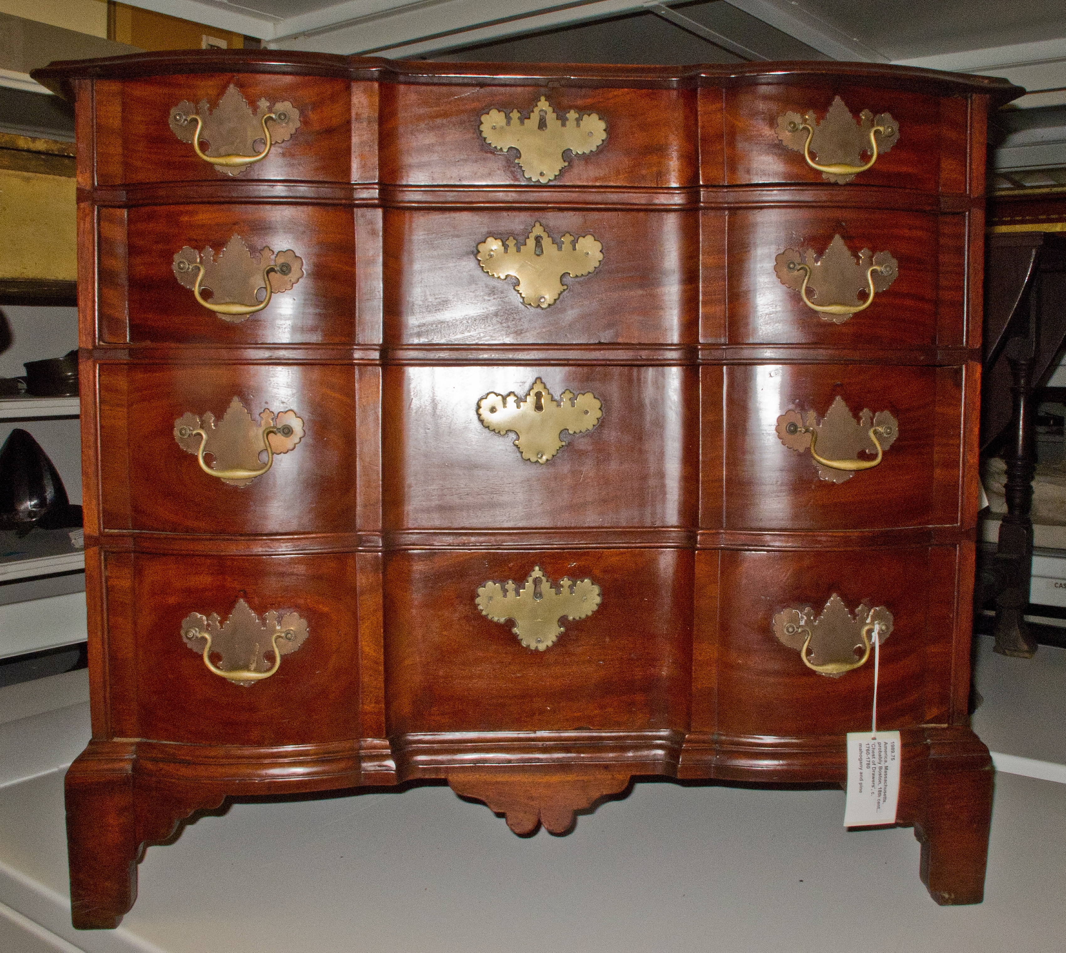 The Chest of Drawers by the artist features a dark wood dresser with a glossy finish. The dresser has a curved top and a scalloped apron. It consists of six drawers arranged in two columns of three, each adorned with brass handles shaped like floral designs. The handles on the left and right columns are accompanied by decorative metal pieces resembling floral motifs. A white tag hangs from the lower right corner of the dresser. The background appears to be a room with white floors and other furniture pieces.
