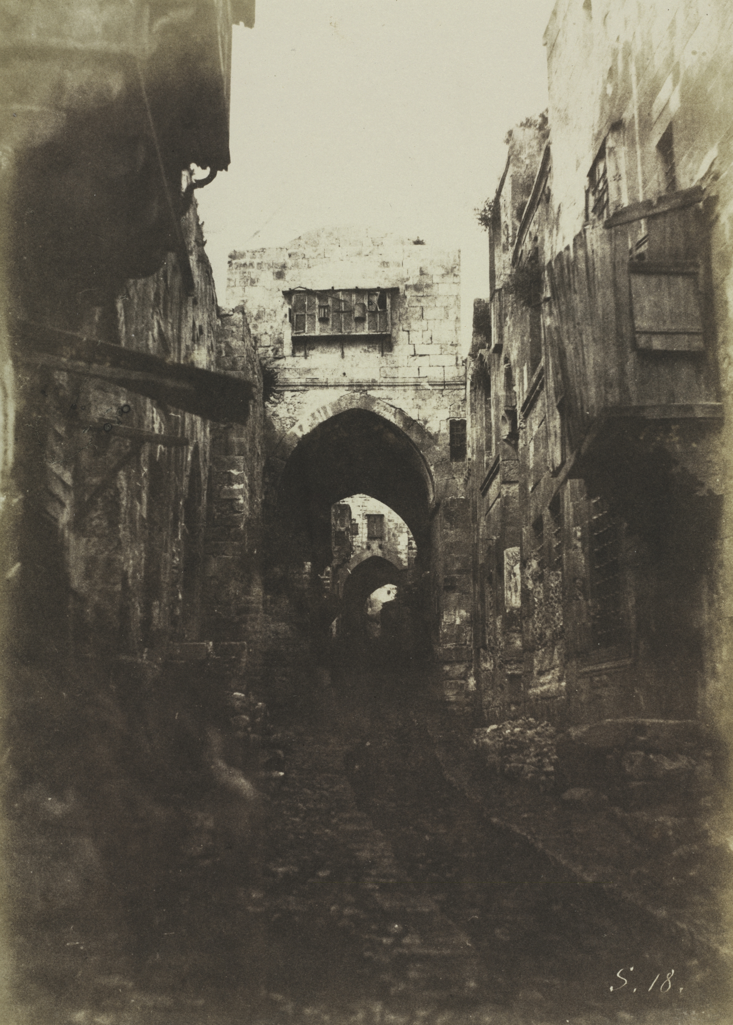 Black and white photograph of a narrow cobblestone street with old stone buildings on either side. The buildings have multiple stories, with some featuring balconies and shutters on the windows. A large stone archway spans the street in the background. A wall with a window is visible beyond the archway. The sky above appears bright. A person's figure is visible in the distance.