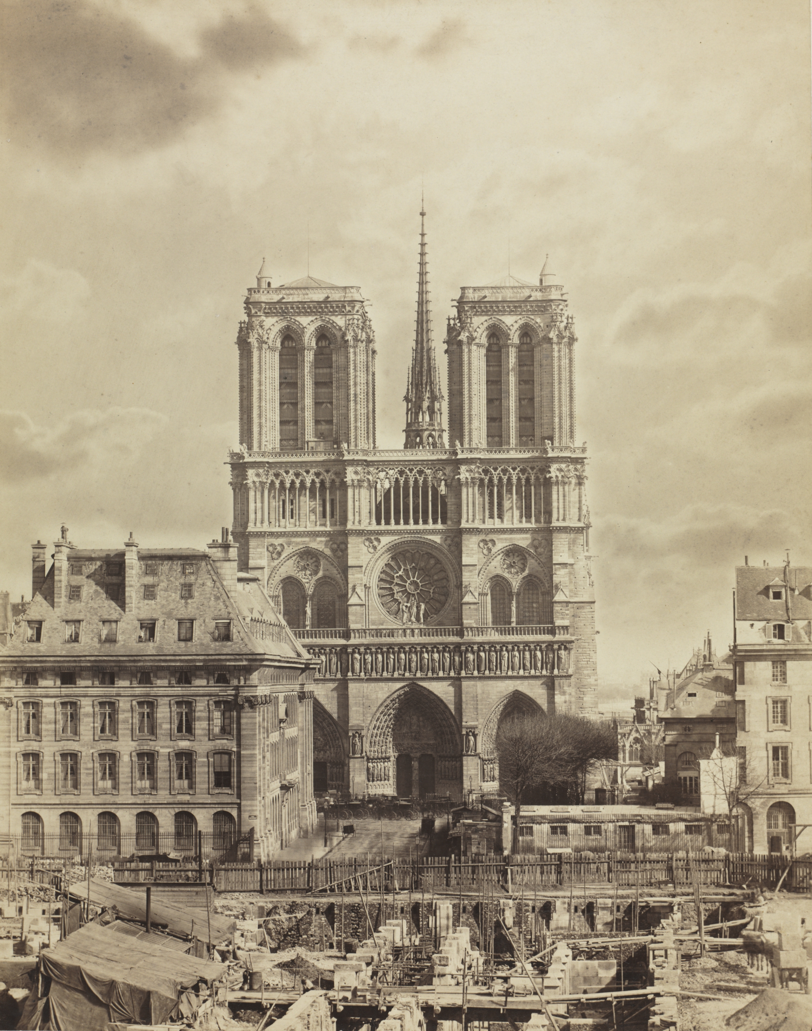 Sepia-toned photograph of Notre Dame de Paris. The cathedral has two tall towers on either side of a central spire. The facade is intricately carved with arches and statues. There is a large rose window at the center of the facade. The cathedral is surrounded by buildings on either side. The foreground shows a construction site with scaffolding and a tent. The sky is cloudy. The image is credited to Charles Soulier.