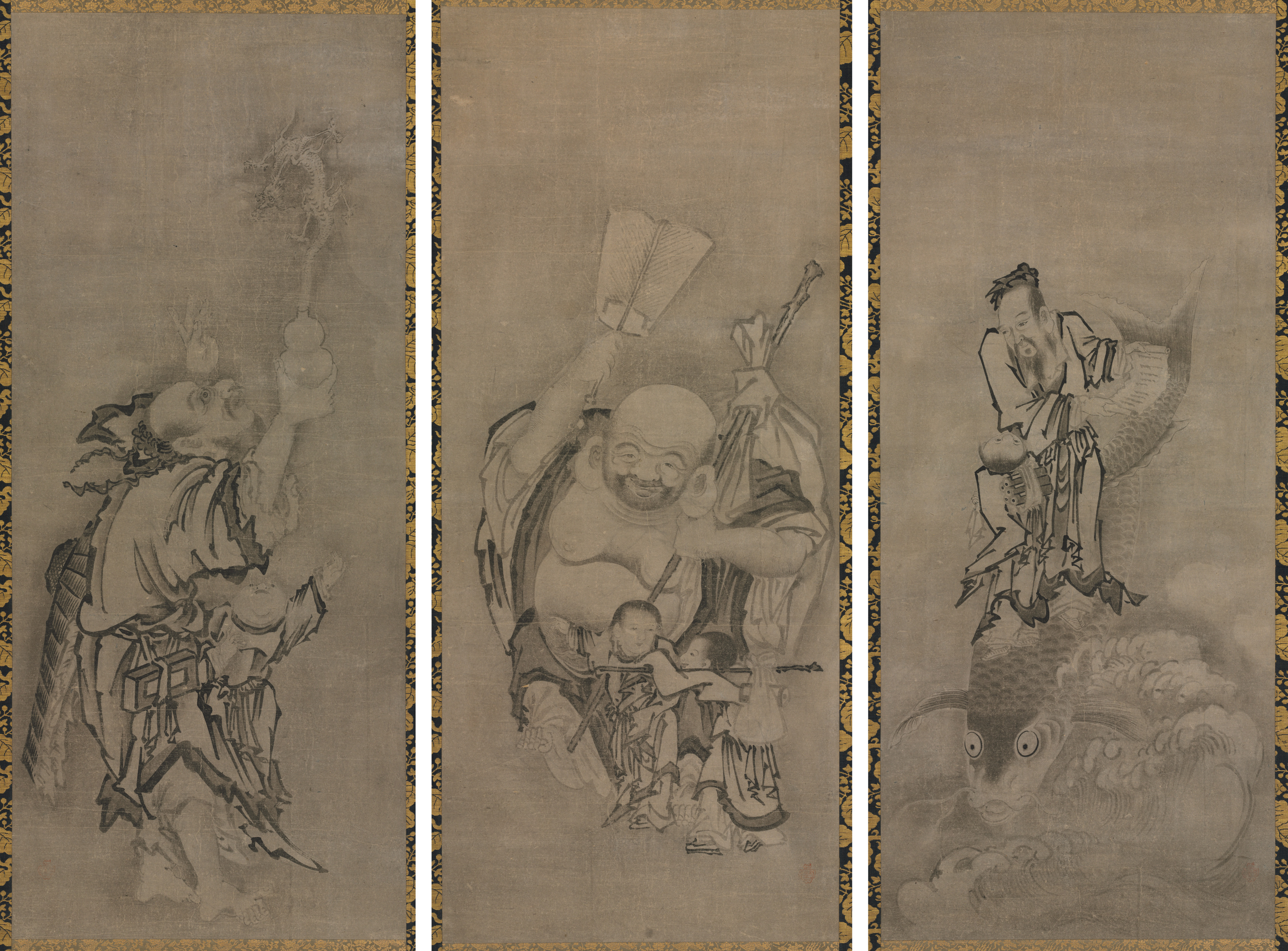 Triptych painting. Left panel: A man with a large head of hair and a white beard, wearing a robe and a headband, holding a staff with a dragon on top. Middle panel: A large, bald man with a big belly and a smiling face, wearing a robe, holding a fan and a stick; two children playing with a bow and arrow. Right panel: A woman wearing a robe and a headpiece, sitting on a fish; her robe flowing in the wind, surrounded by waves. All panels have a beige background and are framed with a gold and black border.