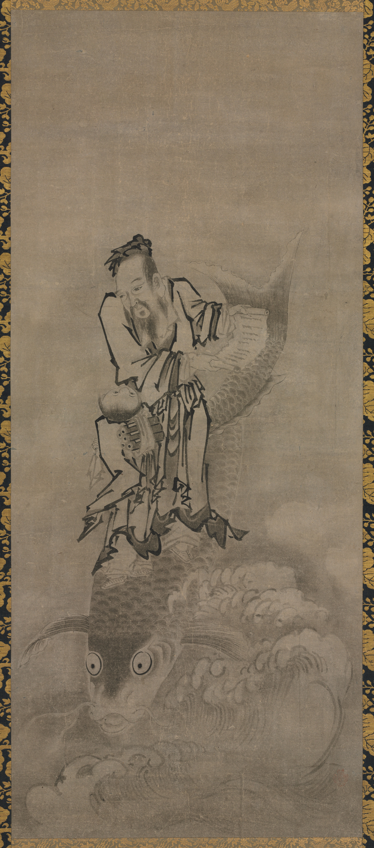 A man with a long beard and topknot wearing a loose robe rides a carp through cloudy water. The man is leaning forward with his face resting on his hand. The carp has large eyes and its body rises out of the water in an S-shape behind the man. The artwork is on a tan background with a black and gold border.