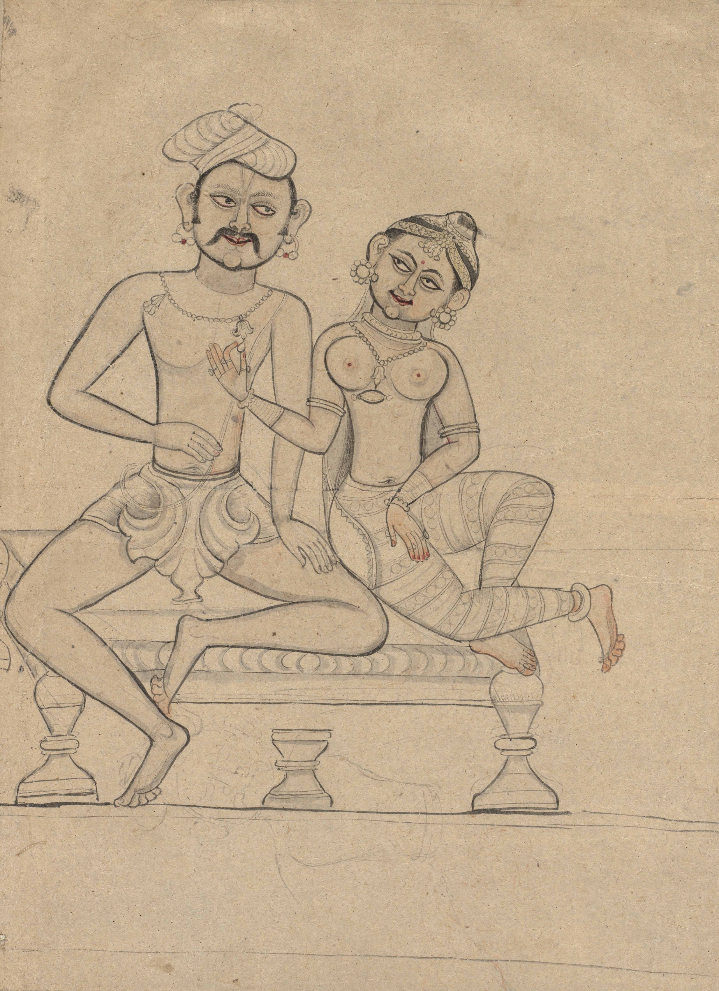 The drawing depicts a seated couple. The man on the left has a mustache and wears a turban, earrings, a necklace, and a short cloth wrapped around his waist. He sits with his left leg bent and right leg straight, his right hand near his chest and left hand on the knee of the woman beside him. The woman on the right wears a headpiece, earrings, a necklace, and bracelets, with her upper body bare and her lower body covered in patterned cloth. Her right leg is bent with the foot behind her and the left leg is bent with the foot in front. They sit on a bench with ornate legs. The background is a plain, aged paper color. The drawing style is simple line work.