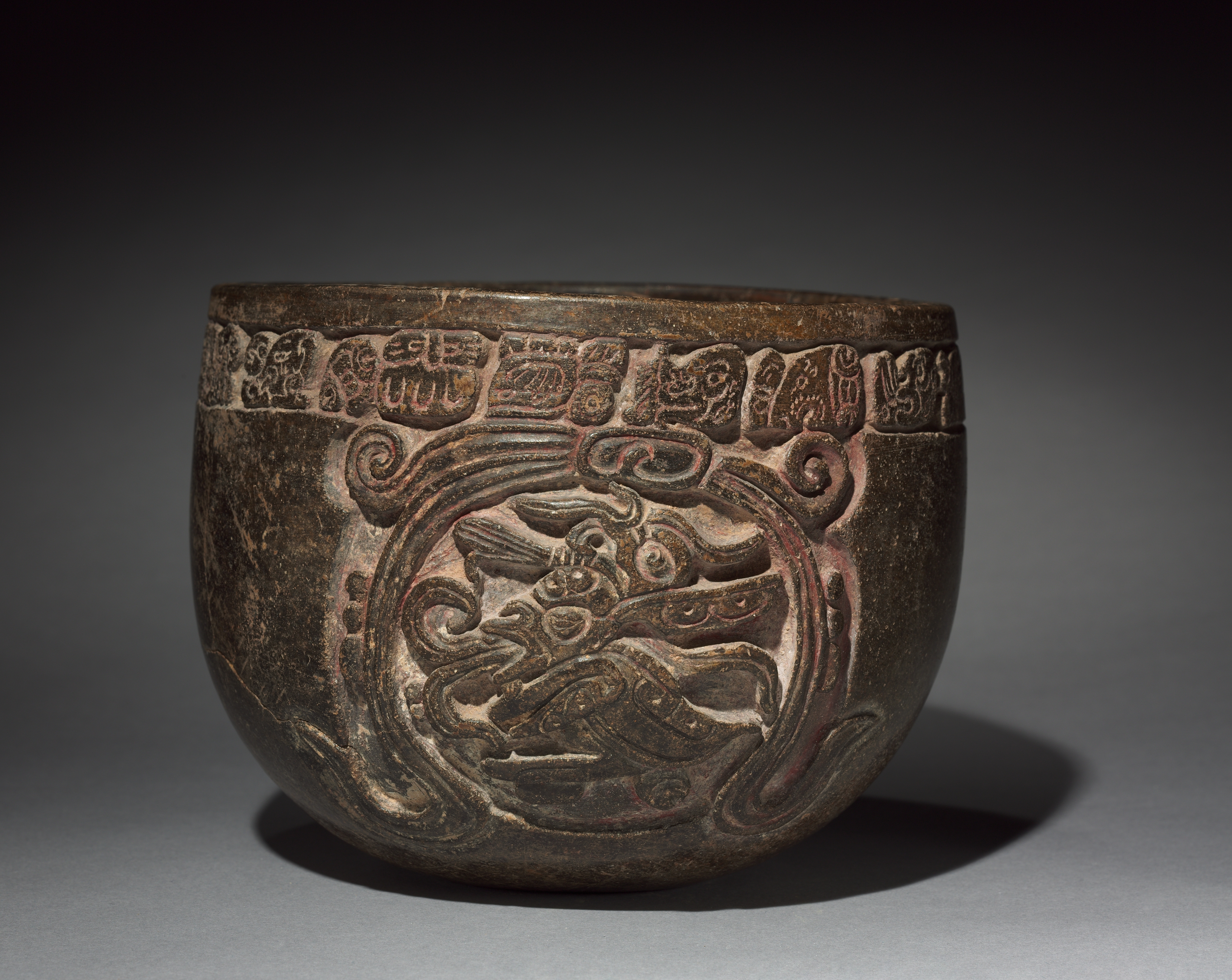 The object is a rounded vessel with a wide mouth and a curved body made of dark brown stone or metal. The vessel has a flat bottom and sits on a surface. The body features a large carved design of an animal surrounded by curved lines and shapes. Above the main design, there is a band of raised symbols. The background of the image is dark gray, with a lighter gray surface that the vessel is sitting on, and a shadow cast to the right. The title of the piece is "Carved Vessel".