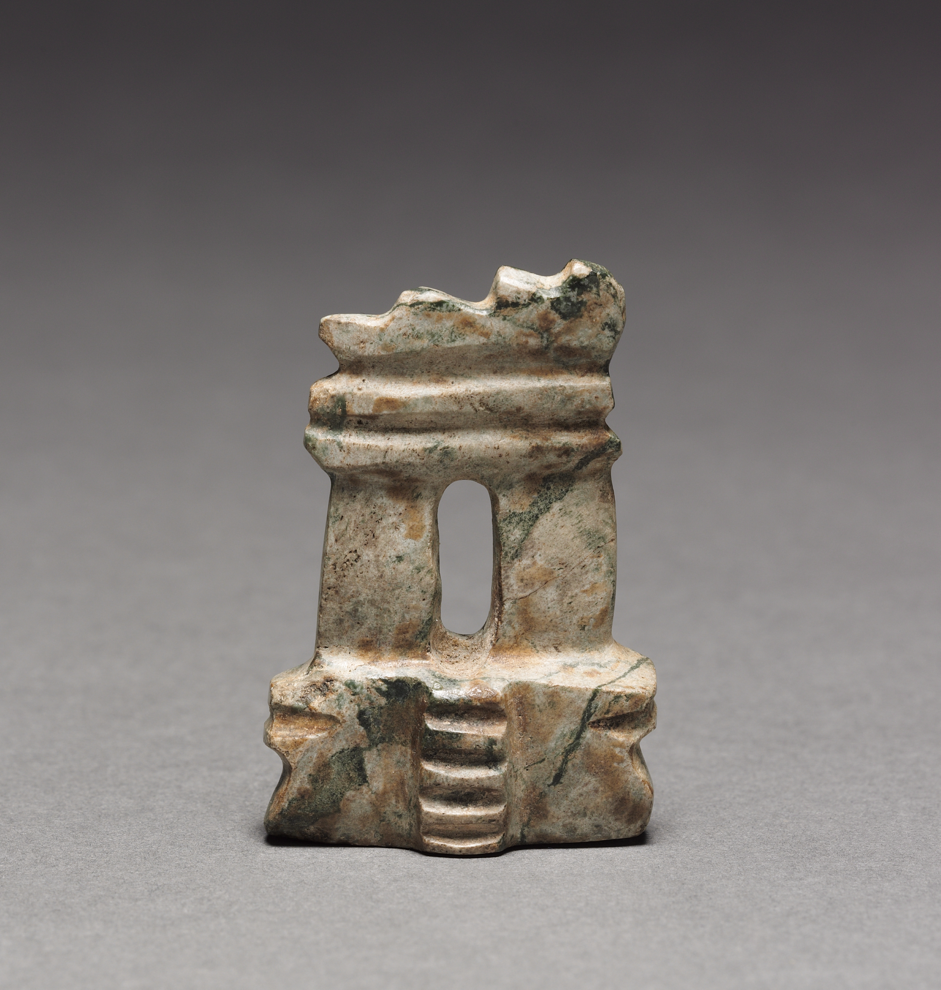Small, weathered stone model resembling a building with a rectangular base, featuring a central vertical hole; the model has a flat base and a recessed area on top; predominantly gray with brown and green streaks; base appears to have steps leading to it. "Architectural Model" by an unknown artist.