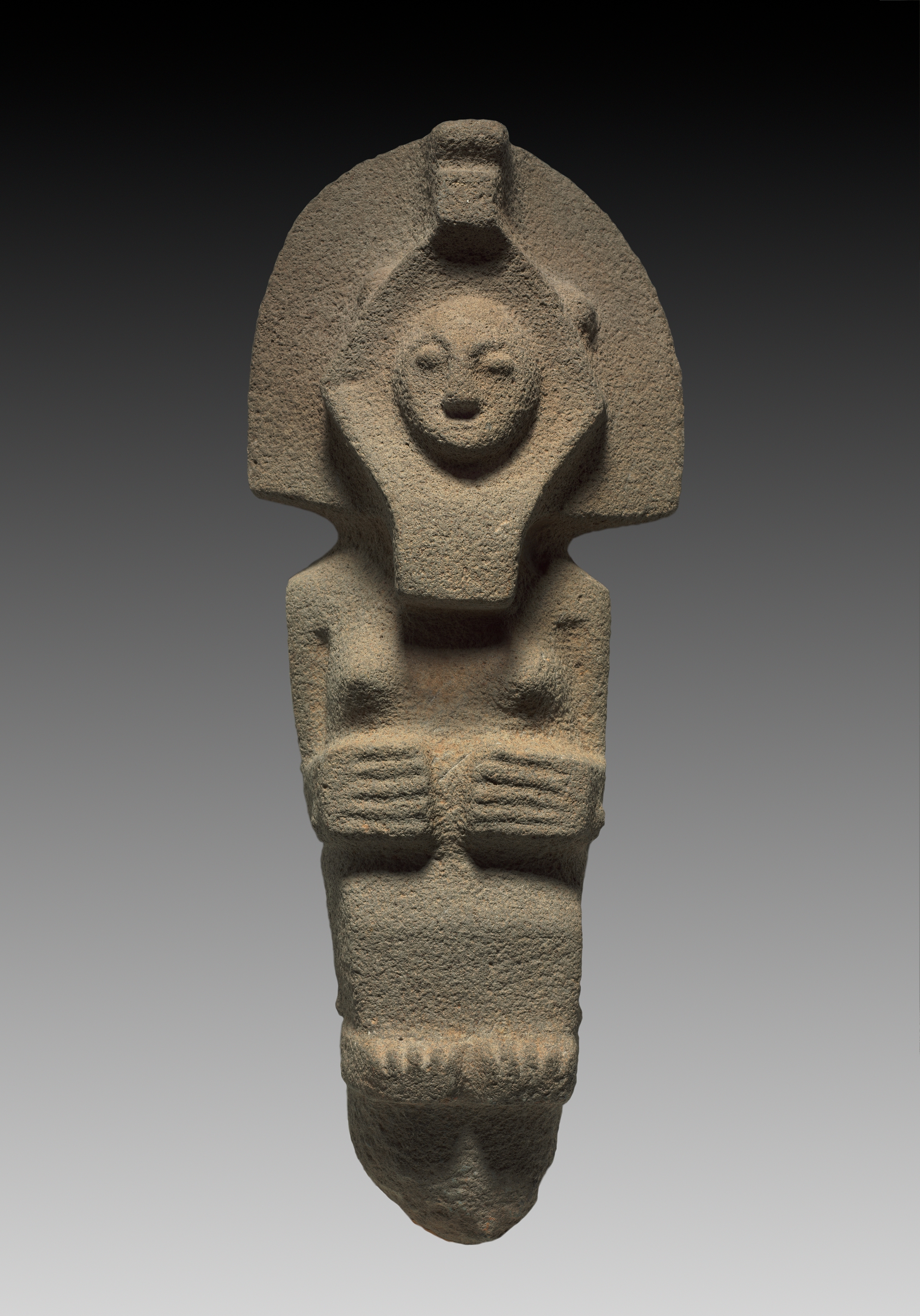 Standing stone female figure with face and body oriented forward. Head framed by semi-circular feature with small protrusion at top. Face has small circular eyes and mouth, nose not visible. Body has horizontal lines across breasts and waist. Lower body tapers to a point. Figure against a gradient background transitioning from black to gray.
