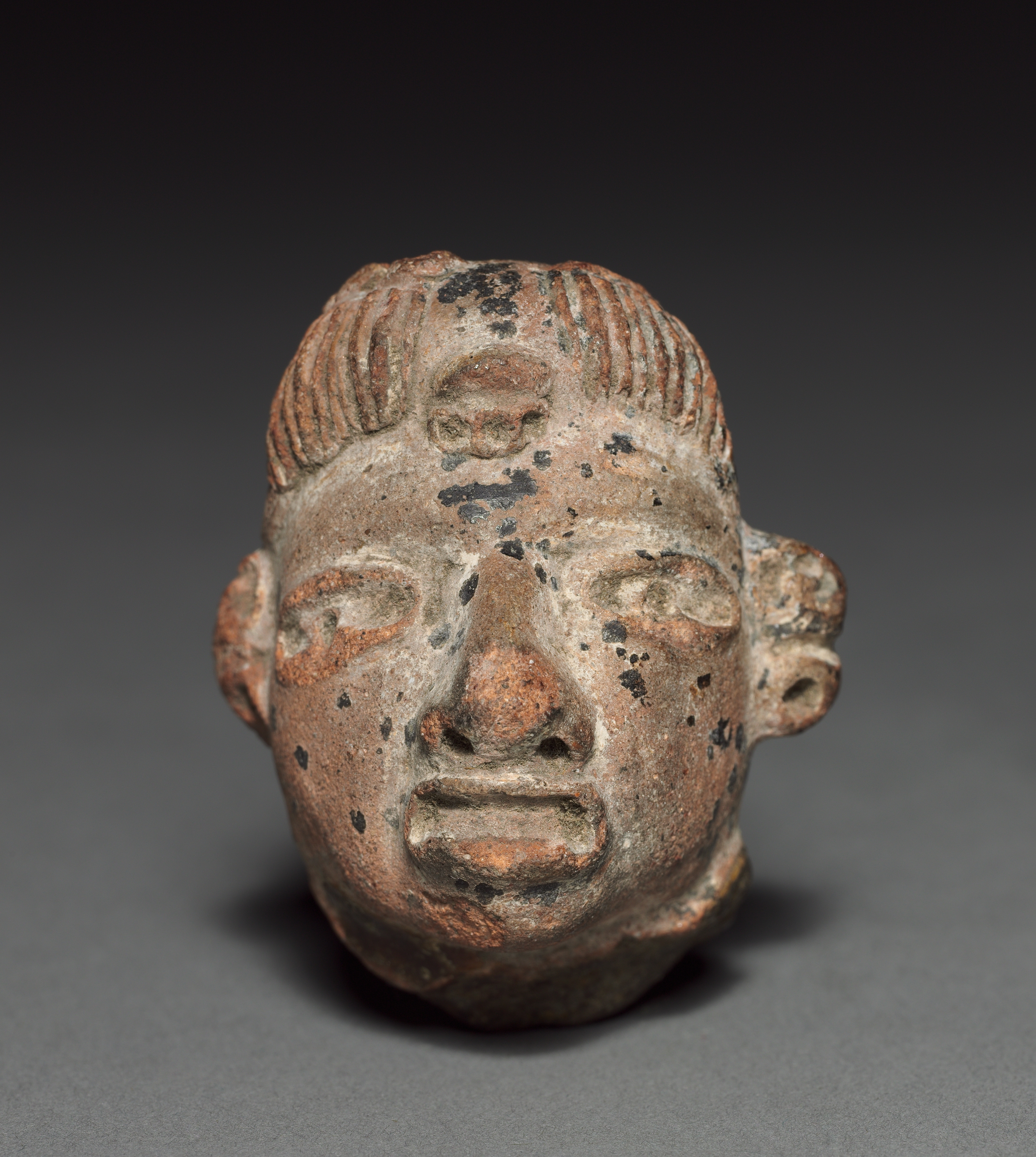The head of a figurine, depicting a human face with a neutral expression, viewed from the front. The figurine head is made of reddish-brown stone with black spots and has a rough texture. It features a short, combed-back hairstyle with horizontal lines on top. The face has a straight nose, small mouth with a thin line for lips, and small ears on either side. The eyes are represented by oval-shaped indentations. The background is a gradient of dark gray to light gray, with the figurine casting a shadow on the surface below.