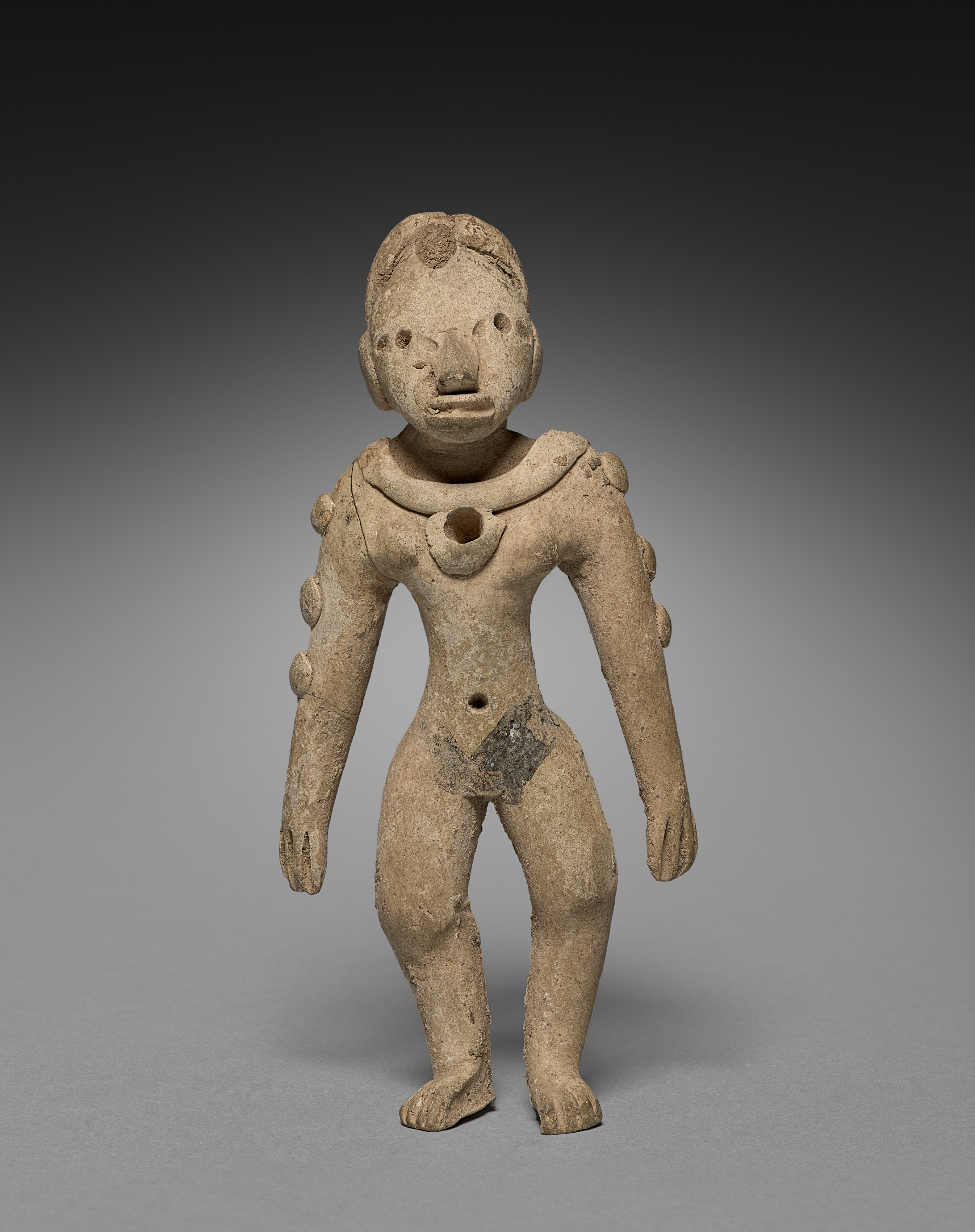 Female Figurine by an unknown artist. A clay figurine of a nude woman with a large head, small breasts, and no arms or hands; she has a large neck hole and a small hole on her abdomen; her body is tan with darker areas where she is worn; she has a large nose, small closed mouth, and small circular eyes.