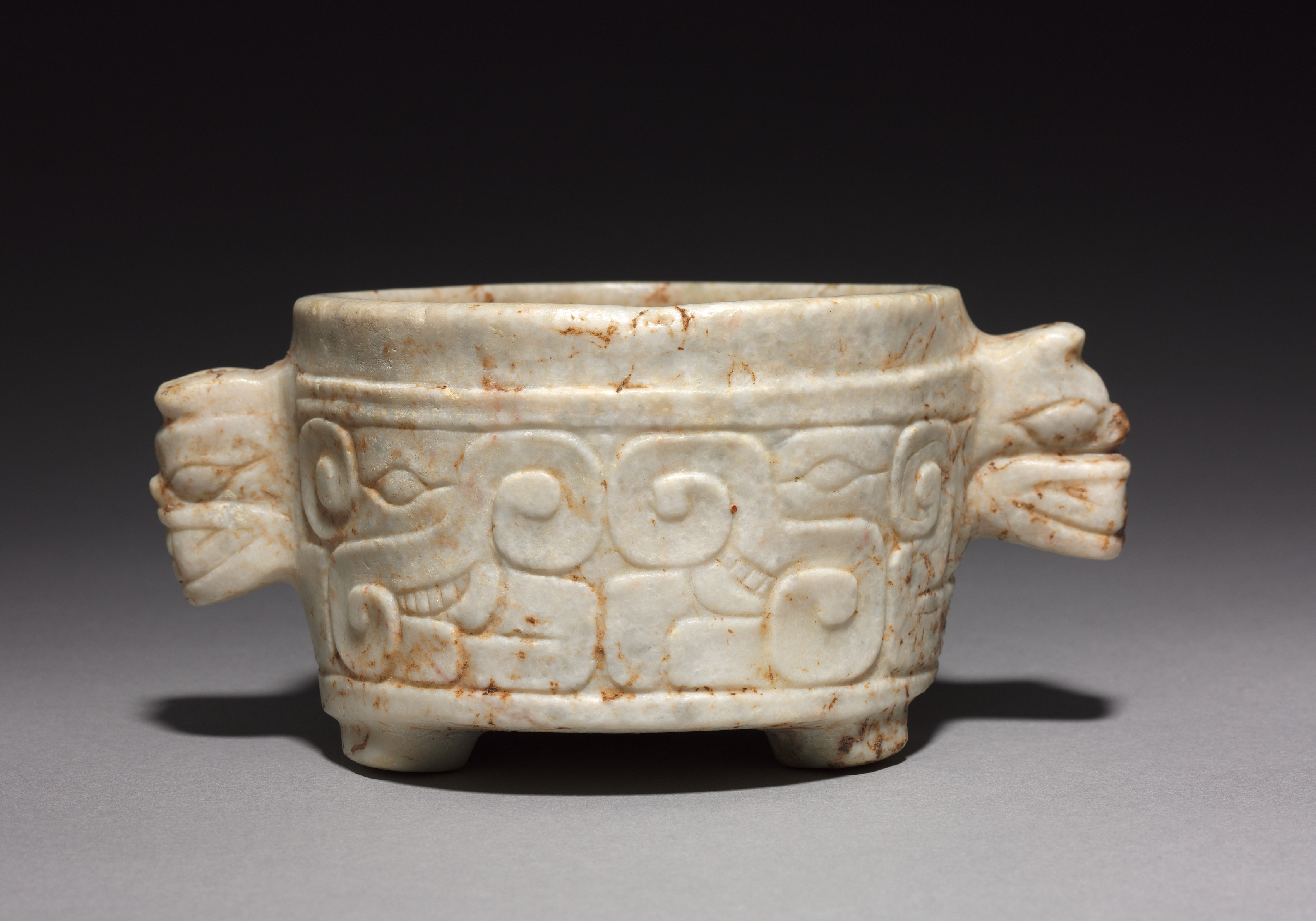 The Tripod Bowl by the artist is a white marble artifact with a cylindrical body and three legs at the bottom. The bowl features two handles on either side, each shaped like a creature's head with a wide mouth and curled snout. The body of the bowl is decorated with intricate carvings of various shapes, including curved lines and geometric patterns. The marble has a marbled appearance with brown spots scattered throughout. The background of the image is dark gray, with a lighter gray surface that the bowl is sitting on.