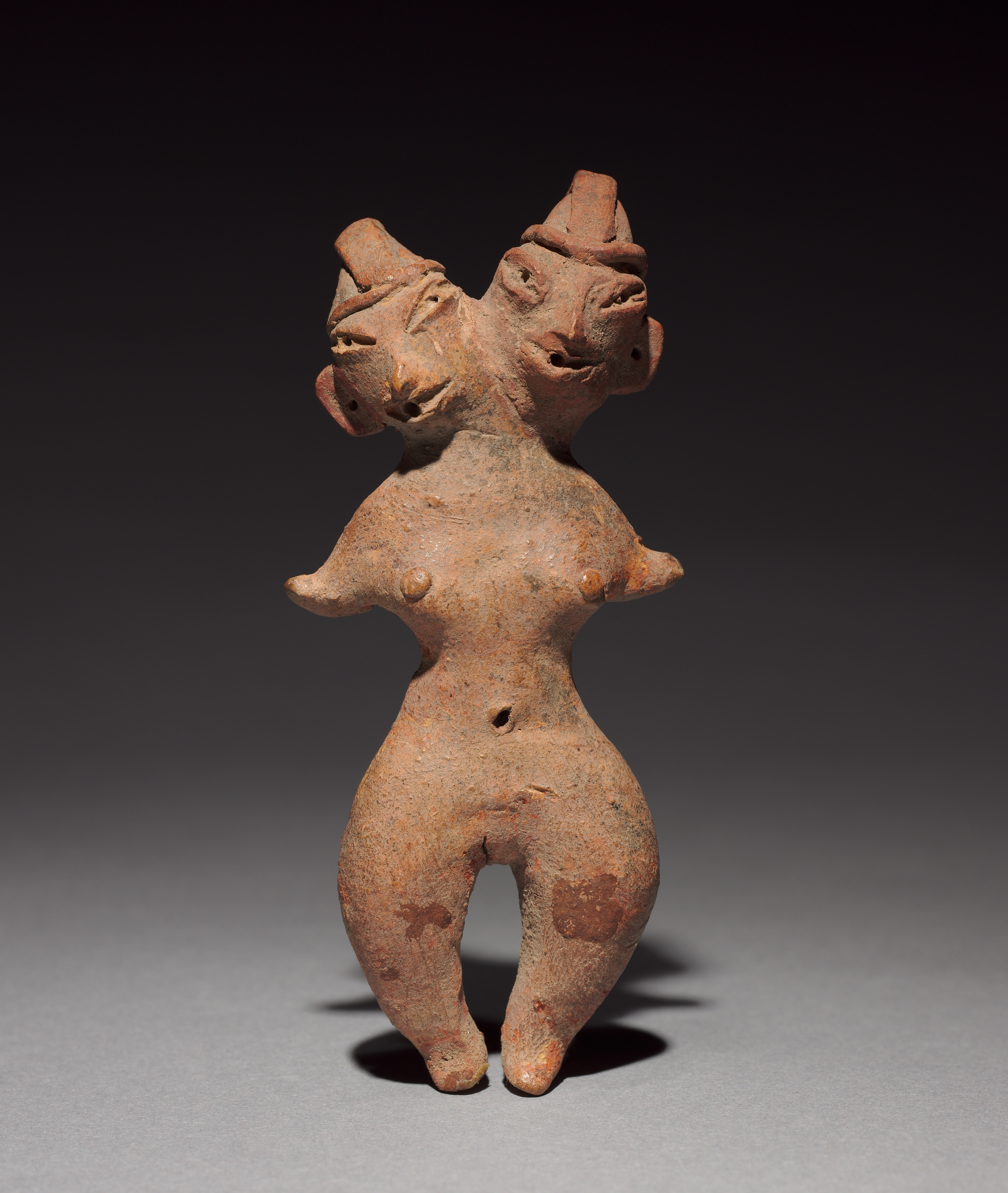 The Two-headed Female Figurine by unknown artist depicts a reddish-brown clay sculpture of a female figure with two heads. The figure has a nude body with visible breasts and a vulva. Two heads are positioned side by side at the top, each with a nose, mouth, and eyes; the left head looks left and the right head looks right. Each head has a distinctive headdress. The background is dark gray to black, with a light gray surface that the figurine stands on.