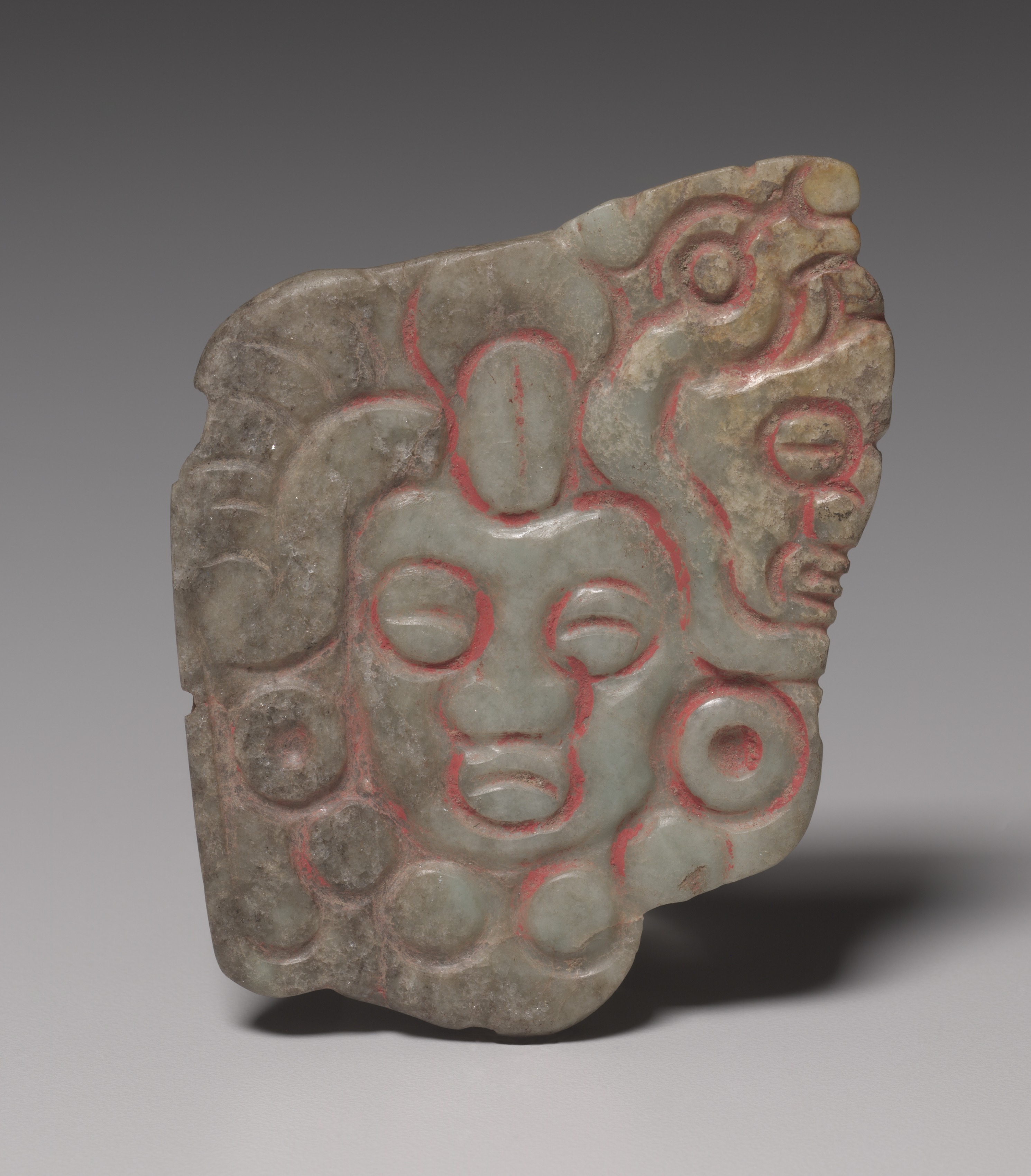 Gray stone plaque with a carved face. The face has red outlines. The face is looking straight ahead. The face has a prominent nose and mouth. The face has curls on top. There are circular patterns around the face. The background is gray. The object casts a shadow. The plaque is irregularly shaped. The face has two eyes. The face appears to have red detailing.