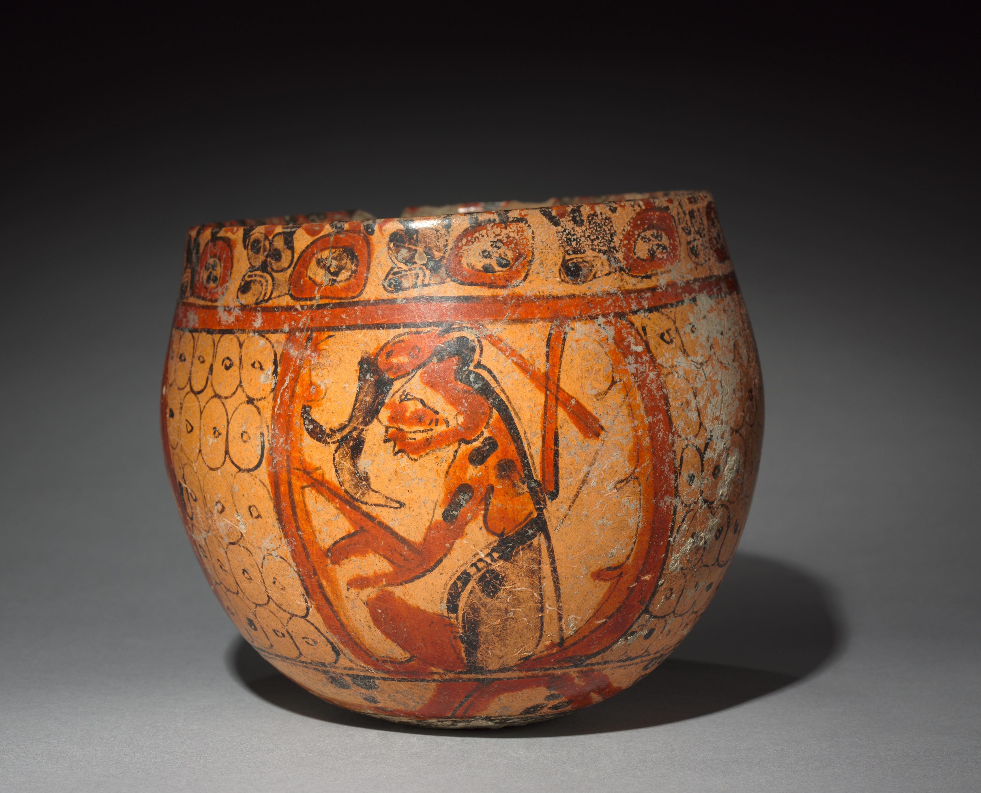 The bowl by an unknown artist titled "Bowl" is a ceramic vessel with a rounded body and a wide mouth. The bowl has a light orange-brown color with darker orange and black painted designs. The top edge features a pattern of circles with various designs inside. A thick orange line encircles the bowl below the edge, followed by a pattern of overlapping ovals. The main body of the bowl showcases a figure in a dynamic pose, possibly dancing or fighting, surrounded by geometric shapes and lines. The background of the image is a gradient from dark to light gray, with the bowl casting a shadow to the right.