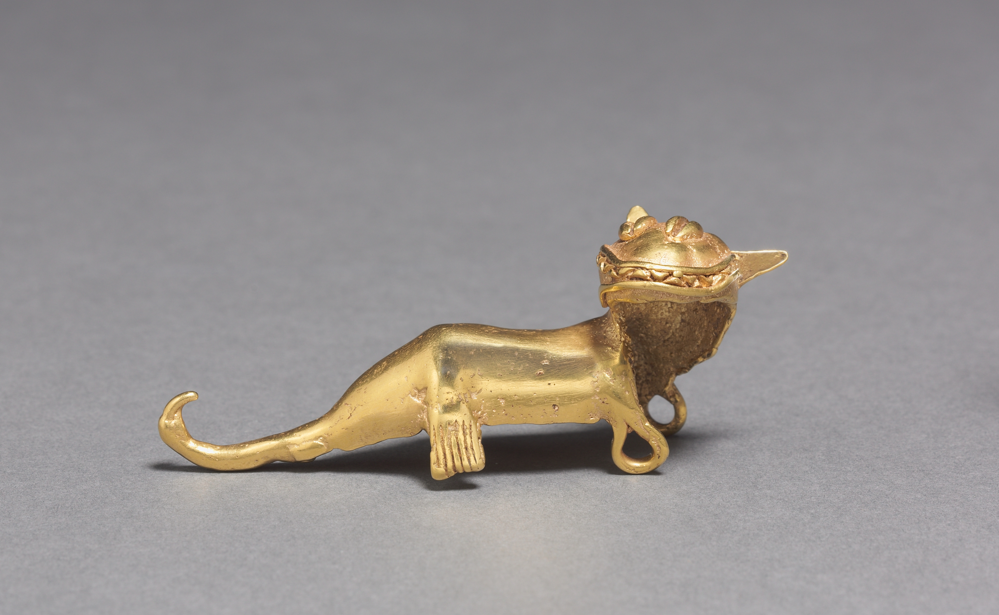 Golden pendant in the shape of a cat or jaguar, body stretched out horizontally with head facing right, mouth open with teeth visible, two small ears on top of head, small loop at end of tail, textured fur on front leg, smooth body with some texture and small imperfections, on gray background. Jaguar Pendant by unknown artist.