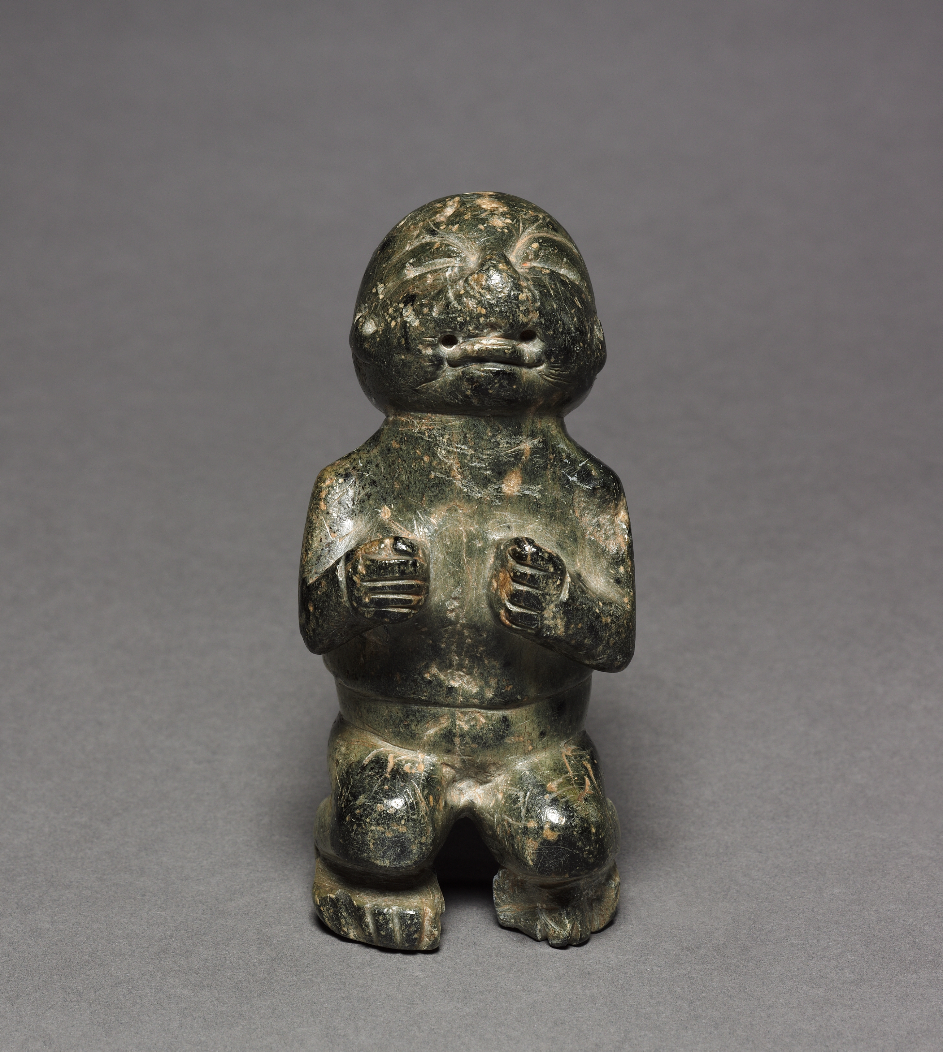 Crouching Figure by Isumangium (Inuit, Canadian, born 1946): A sculpture of a humanoid figure made from dark green stone with lighter brown and white spots. The figure has a large head with a face carved into it, and two small holes for eyes. It has a bulbous body with arms raised in front of the chest and legs spread apart. The figure appears to be crouching or squatting on a flat base. The stone has a shiny appearance, suggesting it may be polished. The background of the image is gray.