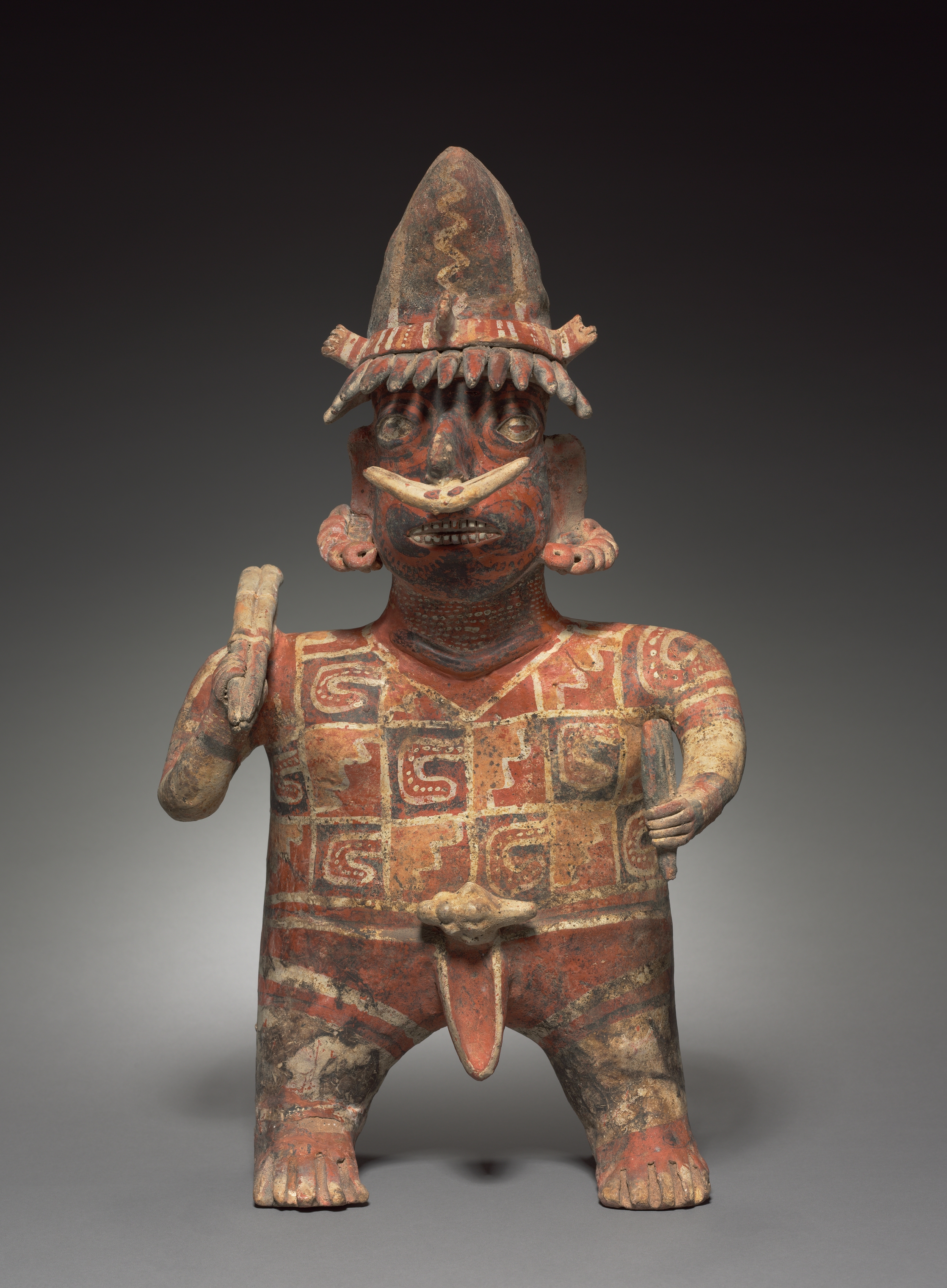 The figure is a standing male with a large hat on. The figure has a wide, toothy grin. The figure's body and face are painted red and the designs on it are painted beige. The figure has a large hat on its head that is tall and pointed. The hat is painted red and black. The figure's body is covered in designs. The figure has a large earring in each ear. The figure's left hand is on its hip. The figure is holding something in its right hand. The figure is barefoot. The background is dark gray and light gray. The title of the image is "Standing Male Figure".