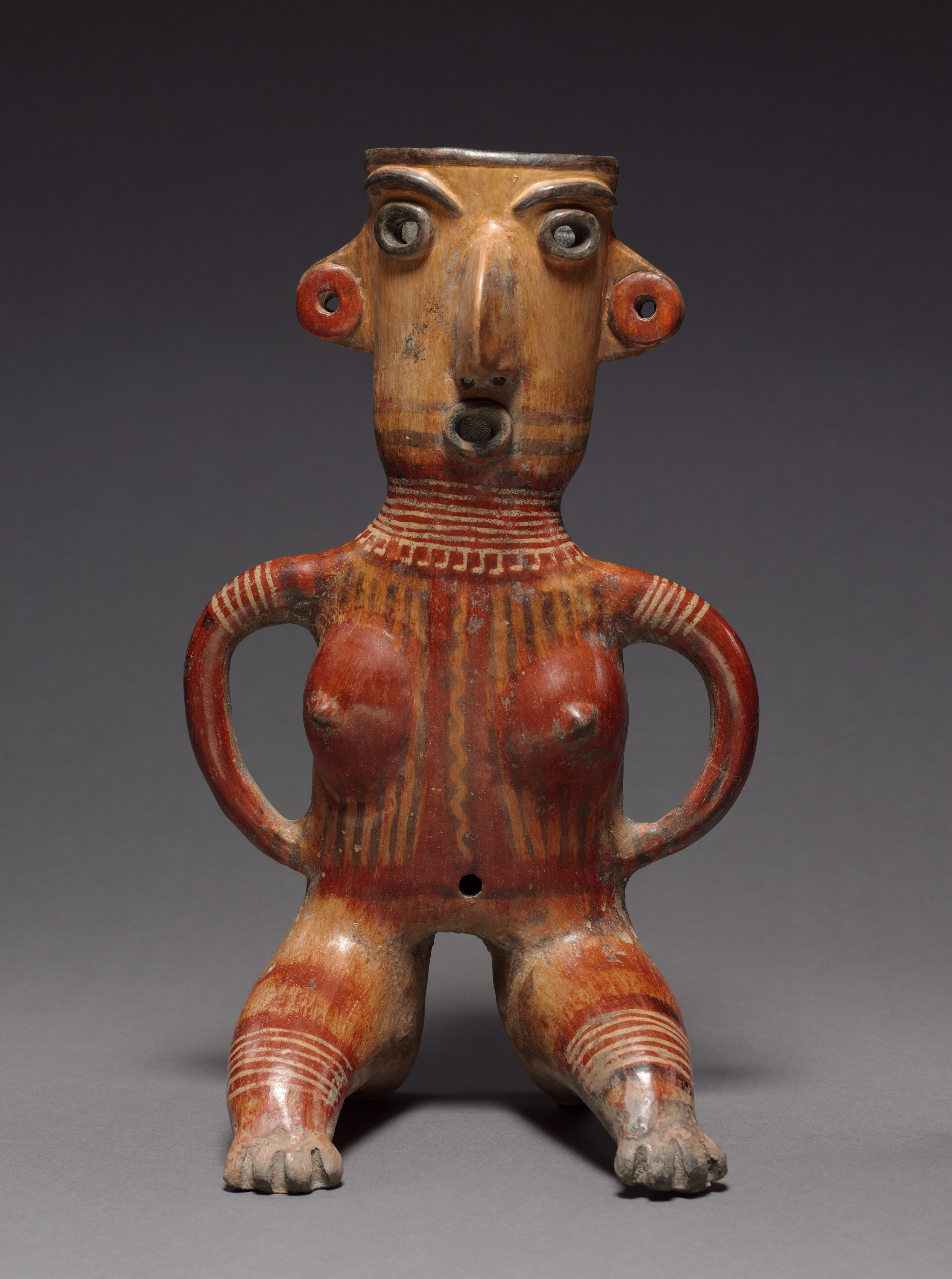Red and brown ceramic figure of a seated female with a cylindrical head. The figure has a long nose and wide eyes. Circular earrings protrude from each ear. The figure has breasts and a hole in the abdomen. Two handles extend from the sides of the figure at the waist. The figure has five-toed feet. The figure's body is decorated with various lines and patterns. The background is dark gray. The figure appears to be titled "Seated Female Figure" by an unknown artist.