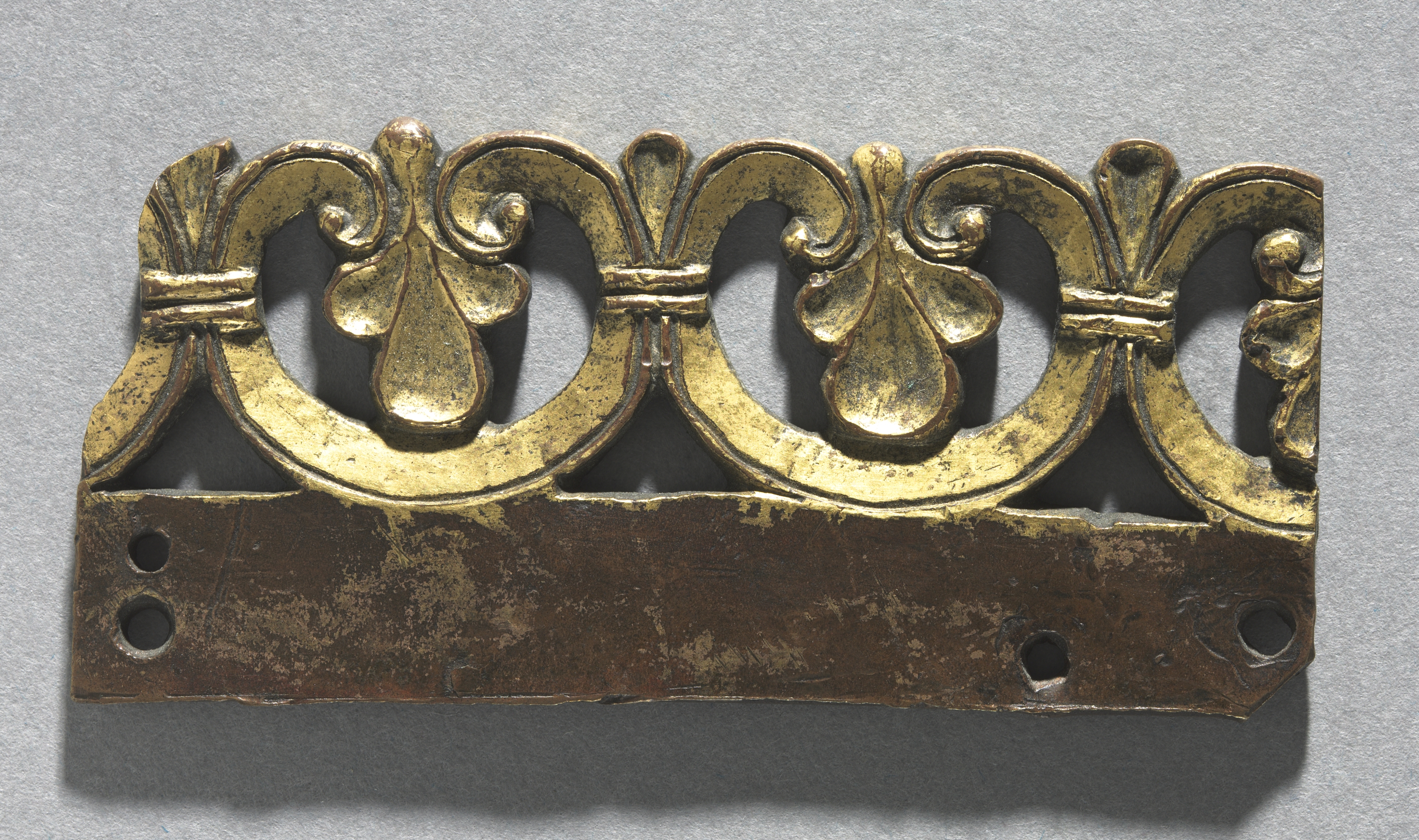 The object is a gold-colored metal piece with a decorative top. The decorative top has four rounded teardrop shapes connected in a row. Each teardrop has a rounded top resembling a fleur-de-lis. A horizontal line wraps around the middle of each teardrop. The base is a flat, dark brown metal plate with three holes, one on each end and one in the middle. The background is a gray surface.