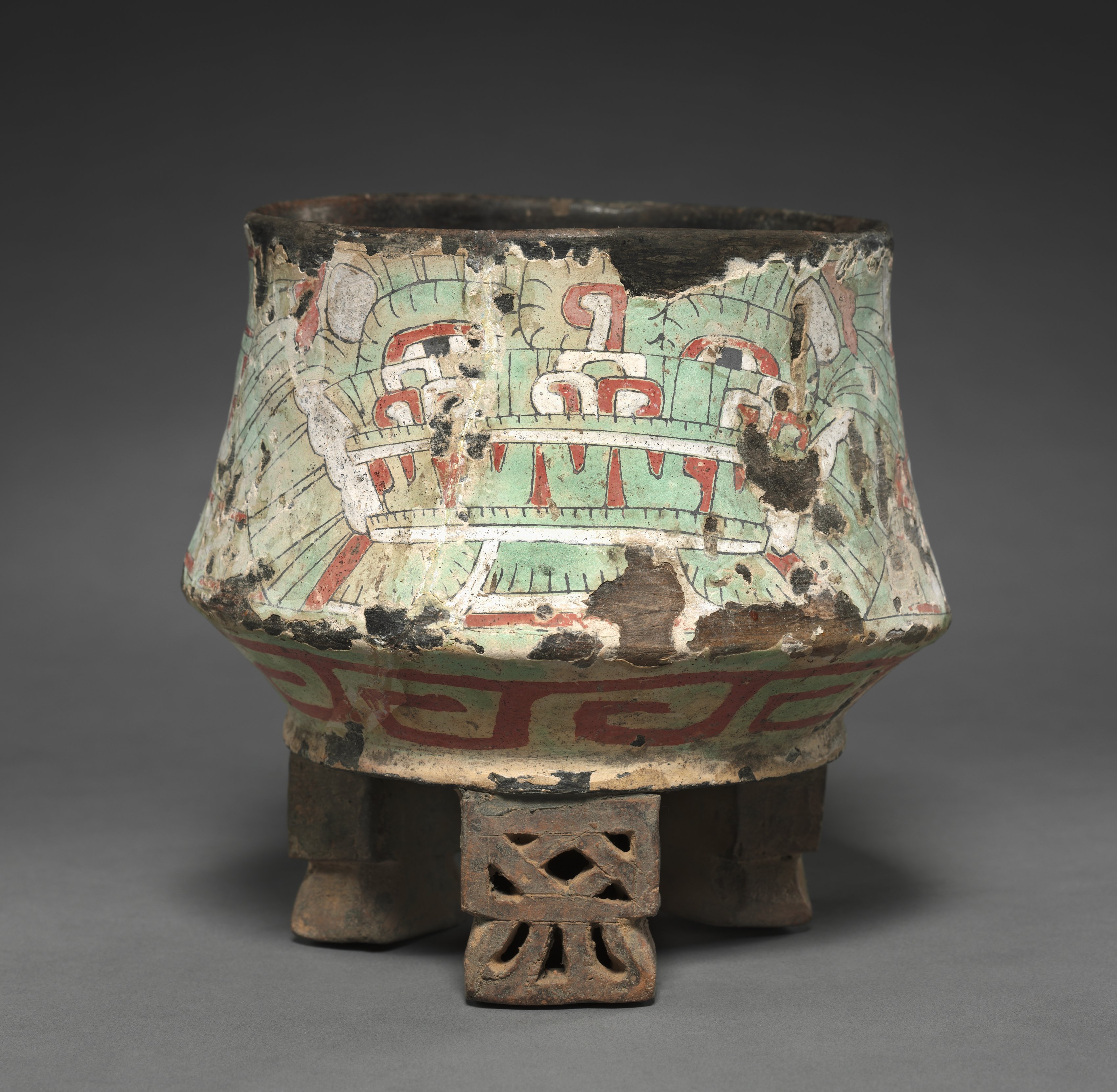 Vessel with Butterfly Headdress by an unknown artist. The vessel has a wide, rounded body made of clay, sitting on three short legs. The body has a wide mouth and is decorated with faded paint. The paint is primarily green, red, and white. The green and red paint forms a band around the middle of the vessel. The white and red paint form a butterfly-like design on the front. The vessel appears to be old and worn, with chipped and faded paint. A small, decorative piece of clay is placed in front of the vessel, likely to support it. The background of the image is dark gray. The vessel is centered in the image.