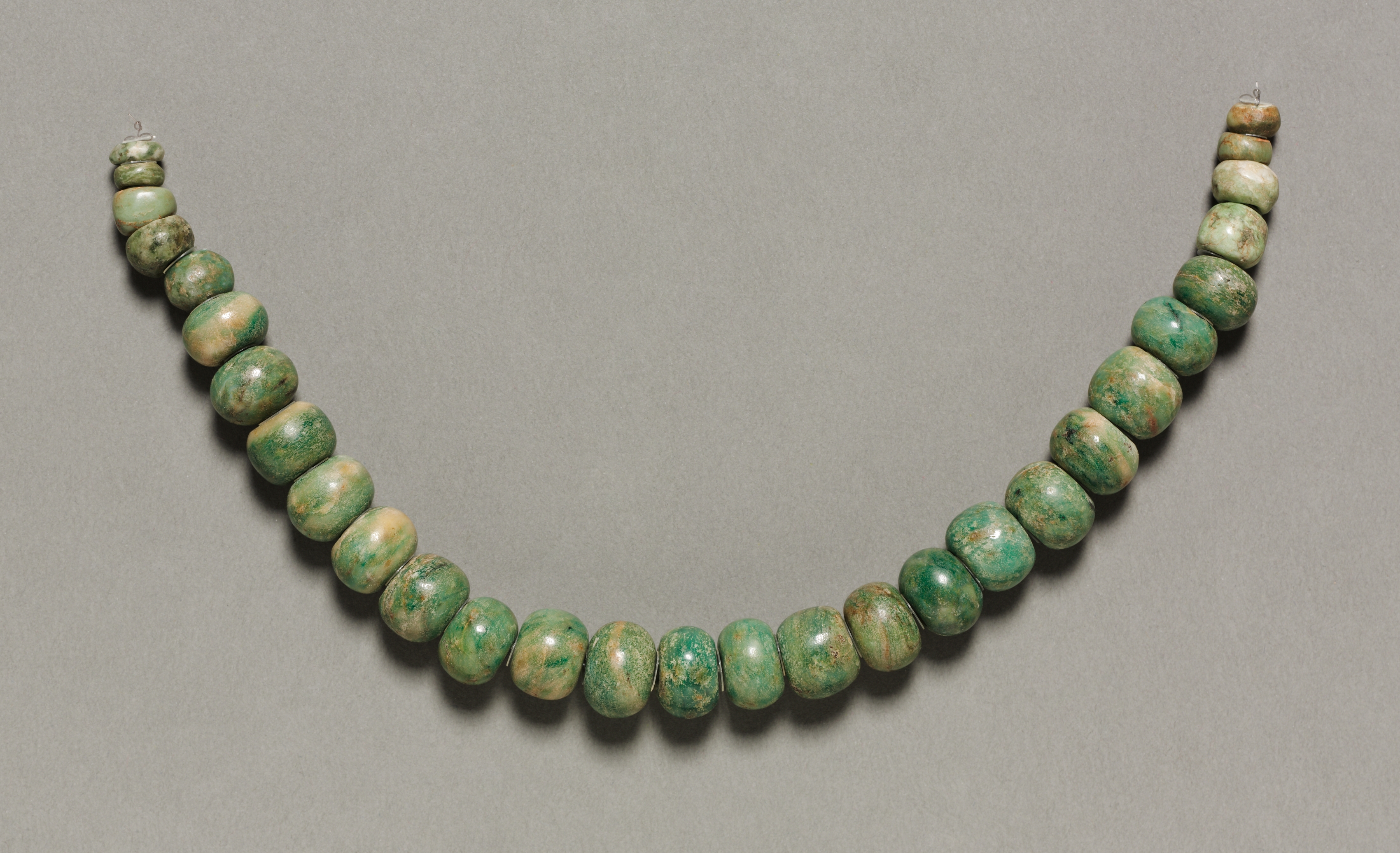 Green and brown beaded necklace, by artist Chanel, titled "Necklace". The necklace is made of large, rounded beads. The beads are predominantly green with brown marbling and splotches. The beads vary in shades of green and brown. The necklace is strung and has metal clasps at both ends. The background is gray. The beads are shiny. The necklace is curved. The beads are rounded and similar in size.