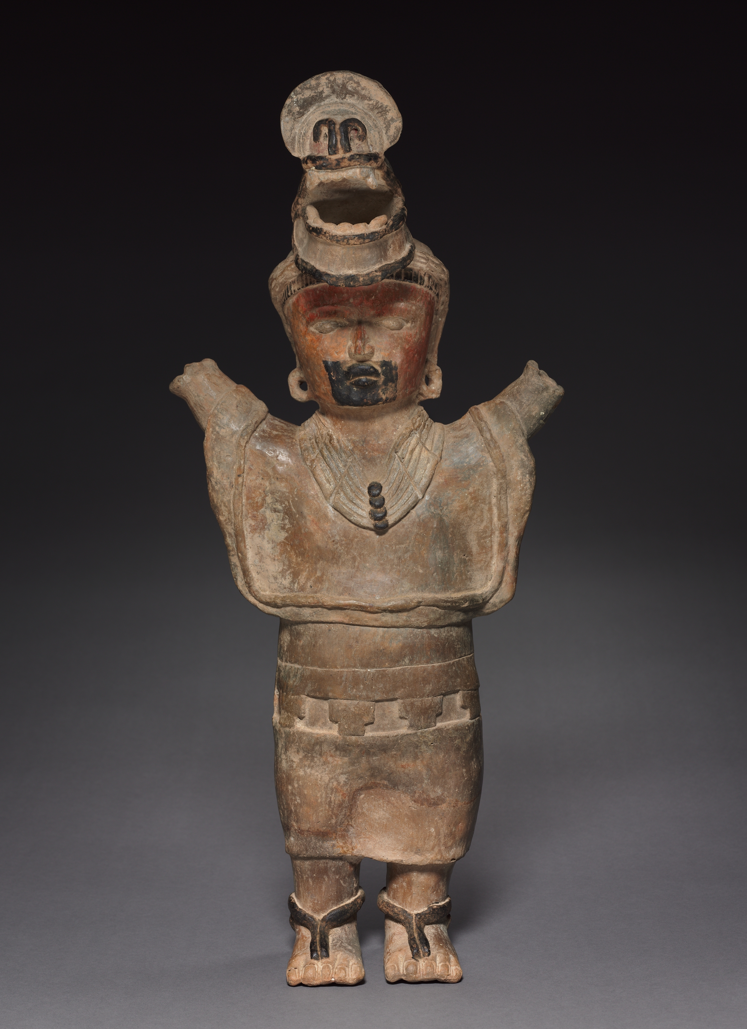 The figure is a standing female sculpture with a light brown color and visible signs of aging. It has a distinctive hairstyle on top of its head, featuring a stack of rounded shapes. The figure's face is painted with dark eyebrows, a mustache, and a mouth. It wears a necklace with spherical beads and a short-sleeved top with a V-shaped neckline. The figure's arms are raised outward from the body, and it has a wide belt around its waist. Its legs are adorned with ankle coverings, and a wide skirt covers the lower body. The background is dark gray, gradating to black at the top. The sculpture represents a standing female figure by an unknown artist titled "Standing Female Figure".