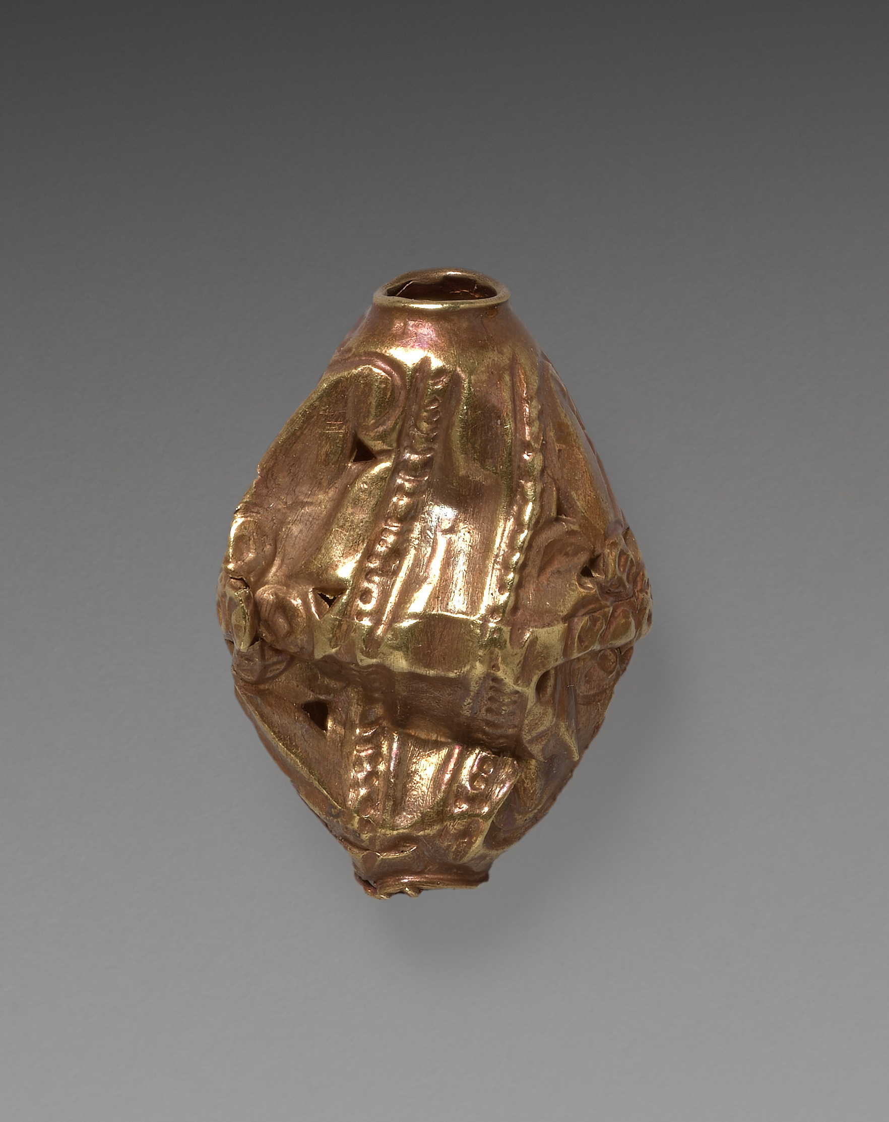 Golden-colored bead with an irregular, faceted shape. A small hole at the top. The surface features intricate designs and patterns, giving it a textured appearance. The bead displays a shiny, reflective surface with hues of gold, pink, and orange. There are raised patterns that could represent leaves or geometric shapes. The background is gray, transitioning from darker at the top to lighter at the bottom. The bead appears to be titled "Bead" by an artist.