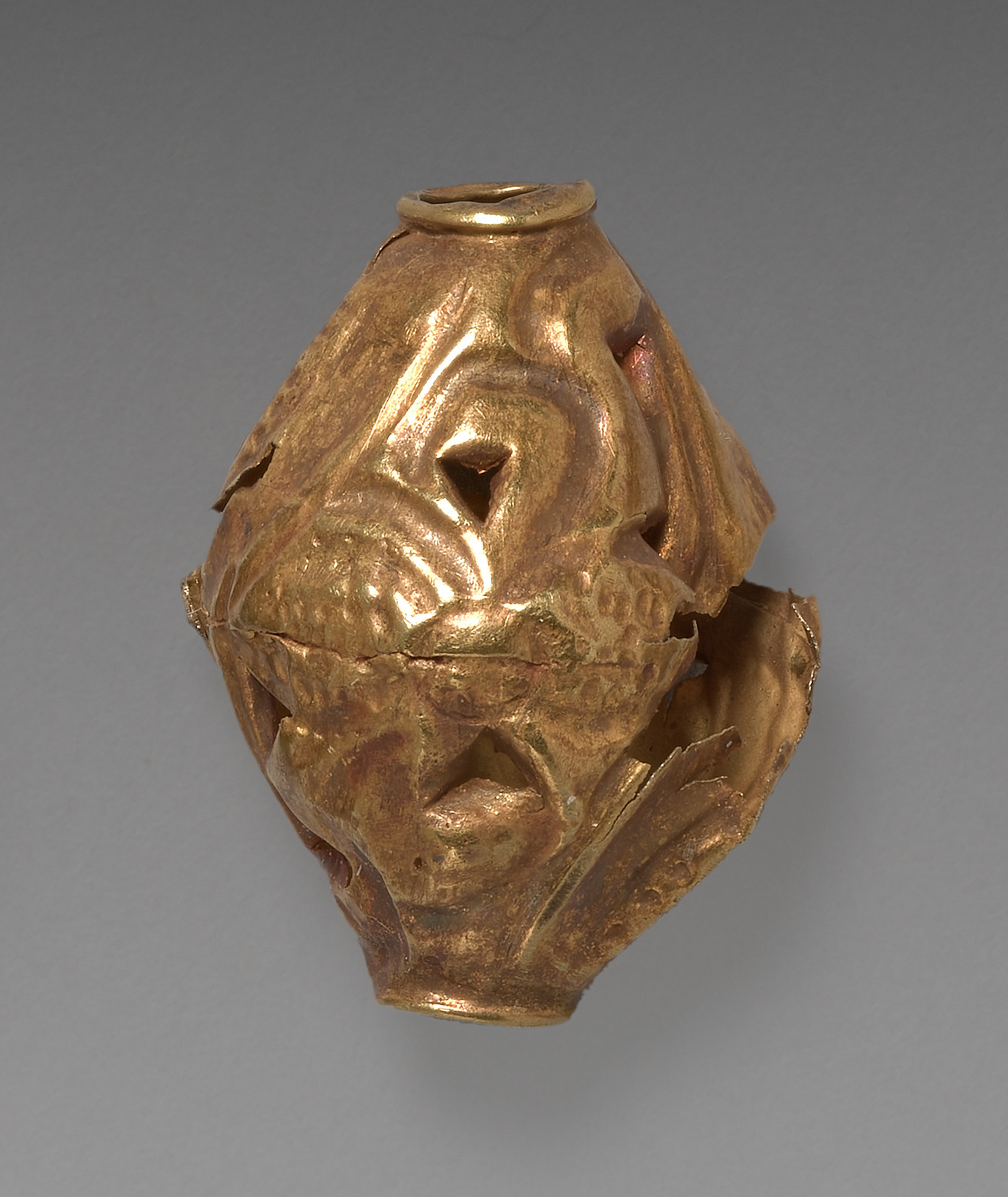 Golden-colored metal object, shaped like a bulbous vessel with a narrow opening at the top. The surface features a textured, organic appearance with several raised, leaf-like protrusions and holes. The object has a jagged, uneven edge around its middle section. The background is a gradient of gray. Title: "Bead". Artist not specified.
