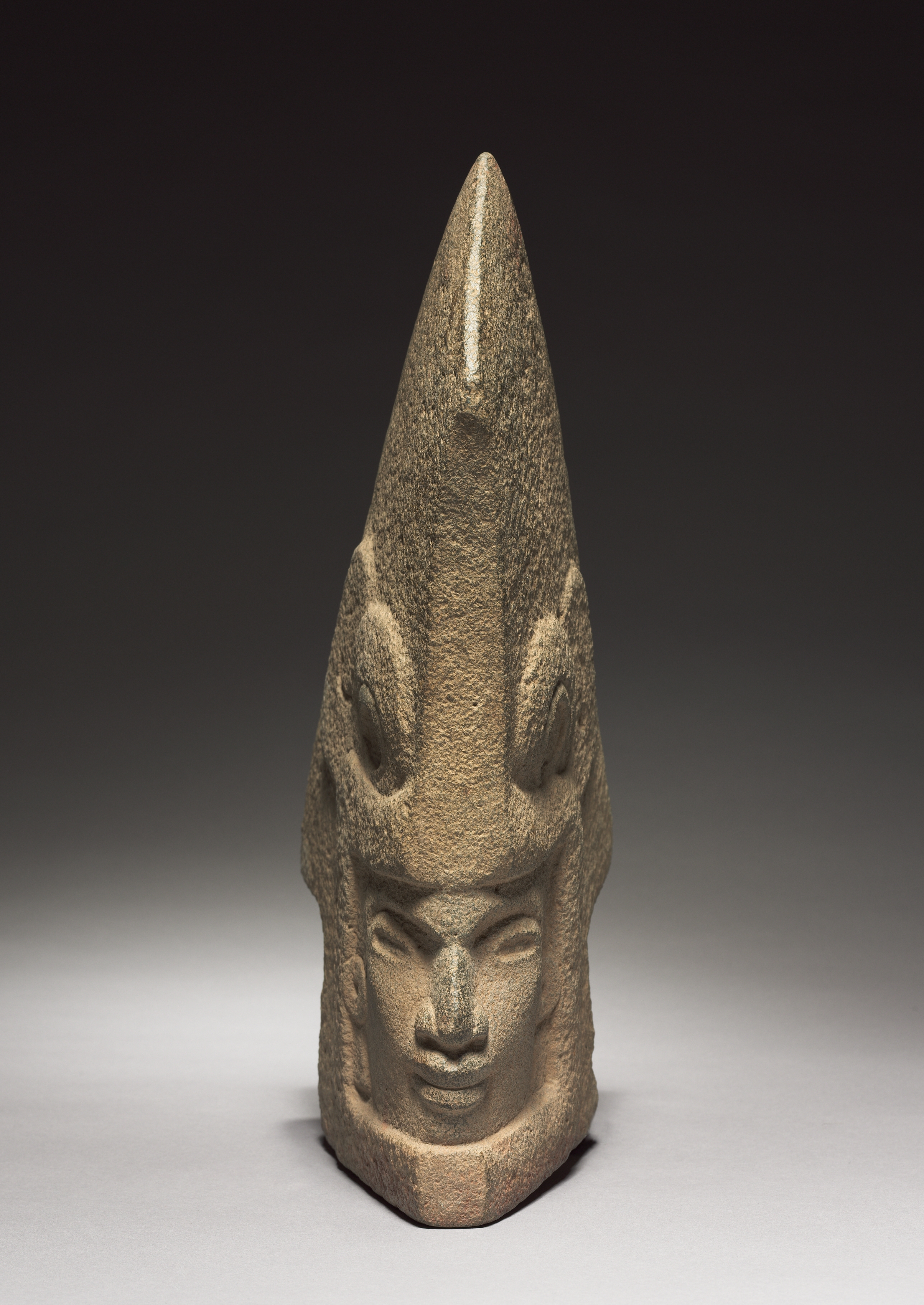 Stone sculpture of a face with a pointed top, resembling a headdress. The face has a neutral expression with straight mouth and closed eyes. The face has a square jawline and the top of the head is pointed. The background is dark gray to light grey gradient.
