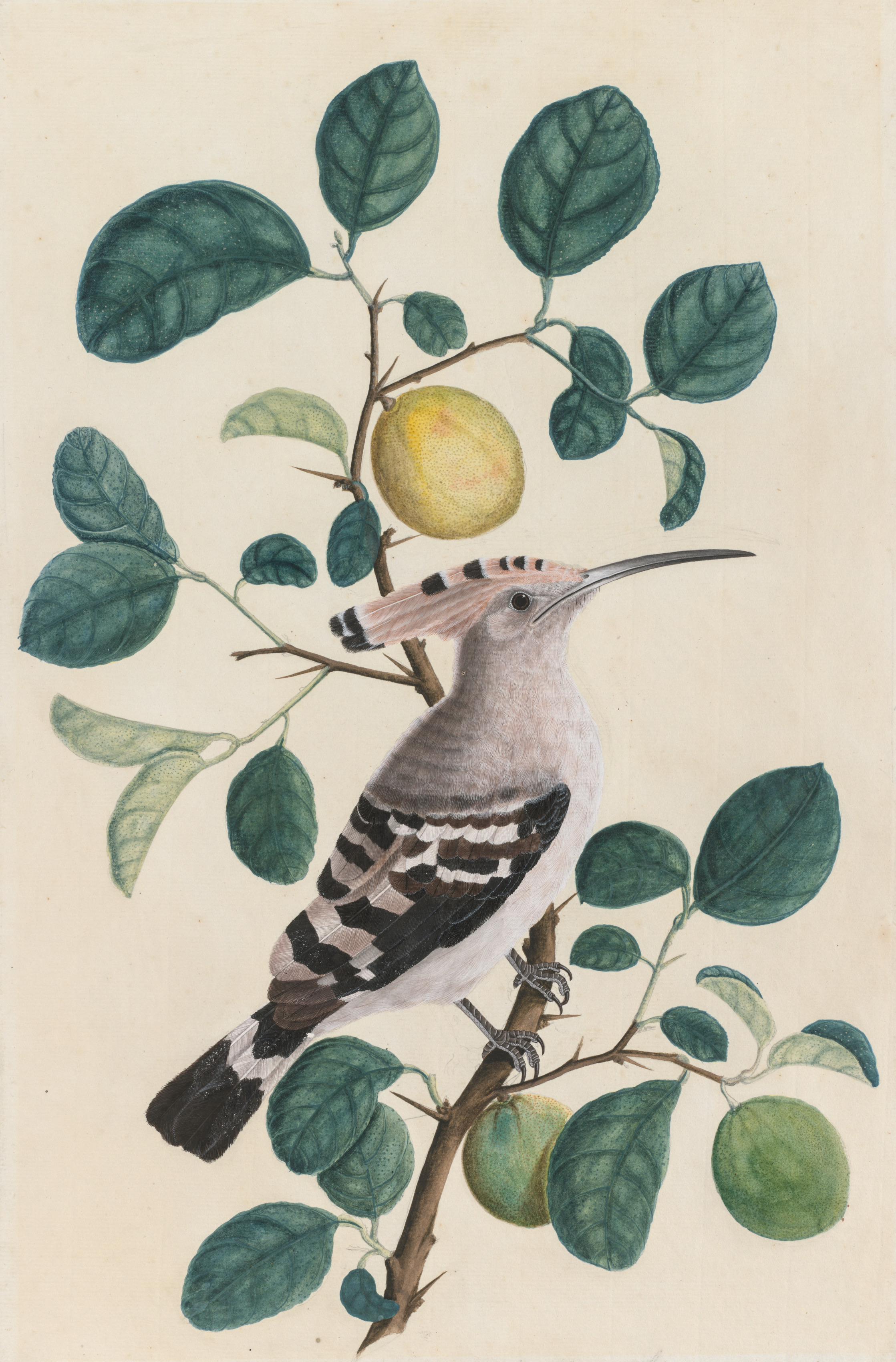 The image depicts a bird on a citrus tree branch. The bird has a long, pointed black beak. The bird's head and neck are light-gray with a crest on top of the head; the crest has black and white stripes. The bird's back and wings are black and white; the wings are black with white horizontal stripes. The bird's belly is white. The bird has black feet with three toes pointed forward and one backward. The bird perches on a brown branch. The branch has sharp thorns. The branch has oval-shaped green leaves. The branch has two green fruits and one yellow fruit. The background is beige. The image title is "Hoopoe on a Citrus Tree Branch". The artist is unknown.